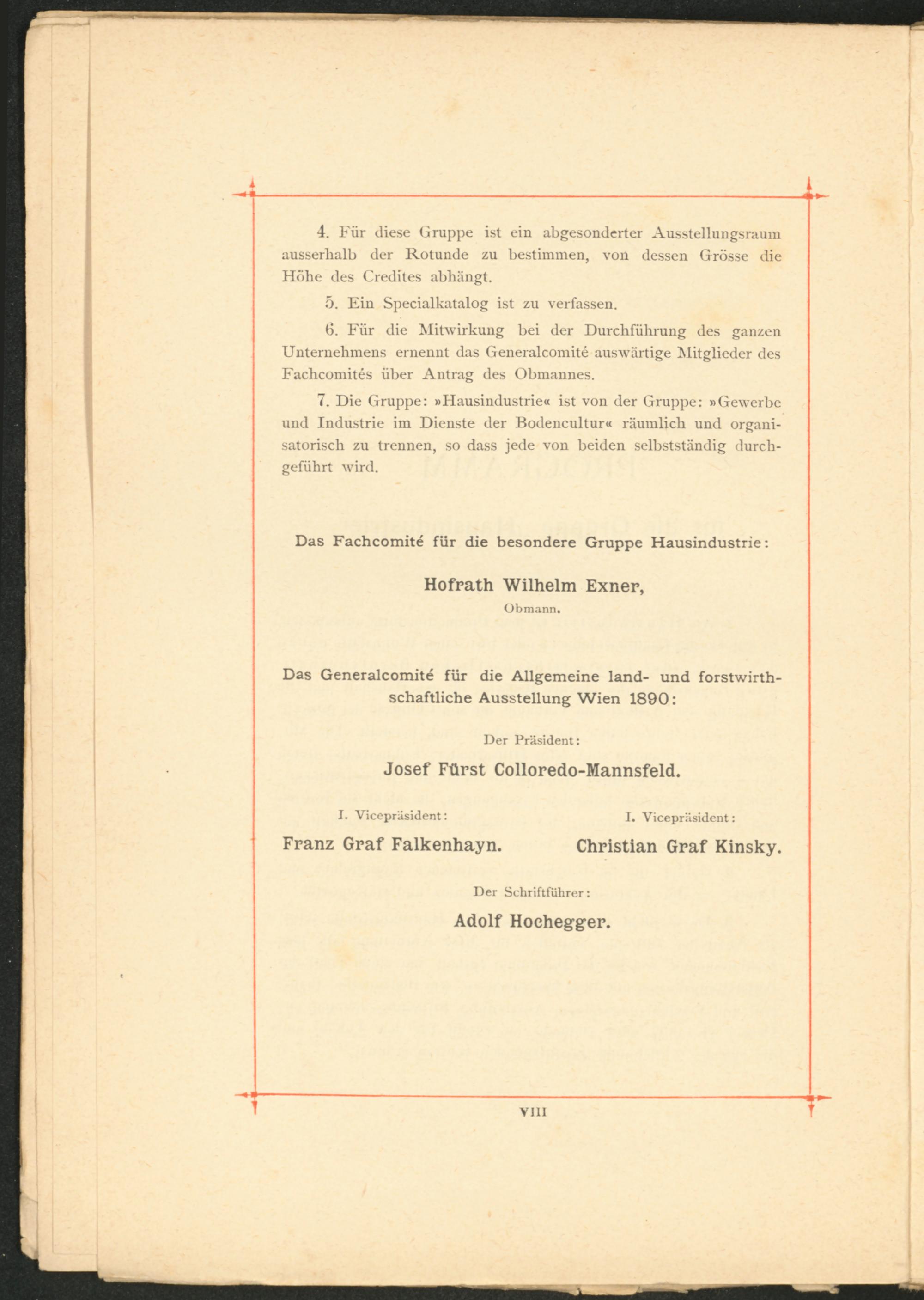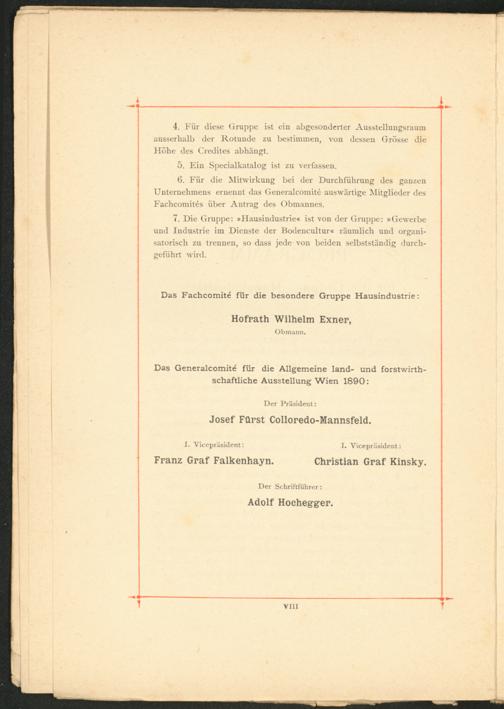7. Die Gruppe: »Hausindustrie« ist von der Gruppe: »Gewerbe und Industrie im Dienste der Bodencultur« räumlich und organi­satorisch zu trennen, so dass jede von beiden selbstständig durch­geführt wird.