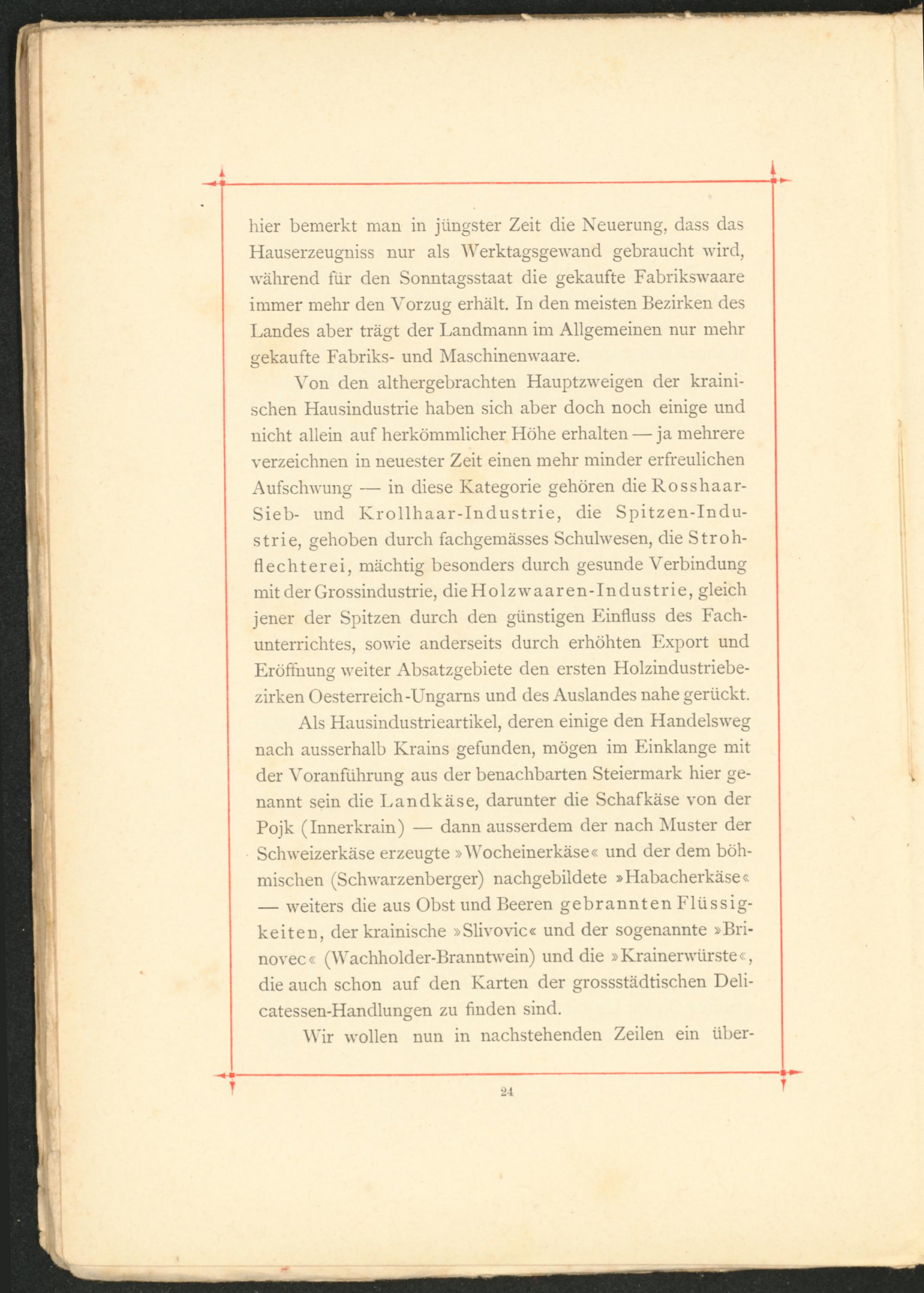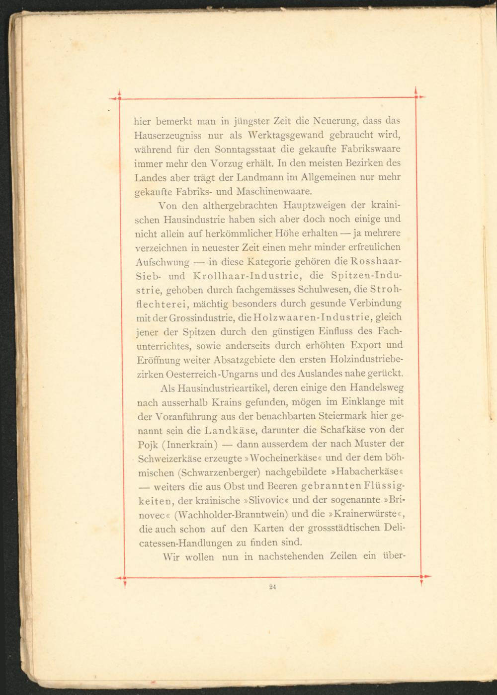 Als Hausindustrieartikel, deren einige den Handelsweg nach ausserhalb Krains gefunden, mögen im Einklänge mit der Voranführung aus der benachbarten Steiermark hier genannt sein die Landkäse, darunter die Schafkäse von der Pojk (Innerkrain) — dann ausserdem der nach Muster der Schweizerkäse erzeugte »Wocheinerkäse« und der dem böhmischen (Schwarzenberger) nachgebildete »Habacherkäse« — weiters die aus Obst und Beeren gebrannten Flüssigkeiten, der krainische »Slivovic« und der sogenannte »Bri- novec« (Wachholder-Branntwein) und die »Krainerwürste«, die auch schon auf den Karten der grossstädtischen Deli- catessen-Handlungen zu finden sind.