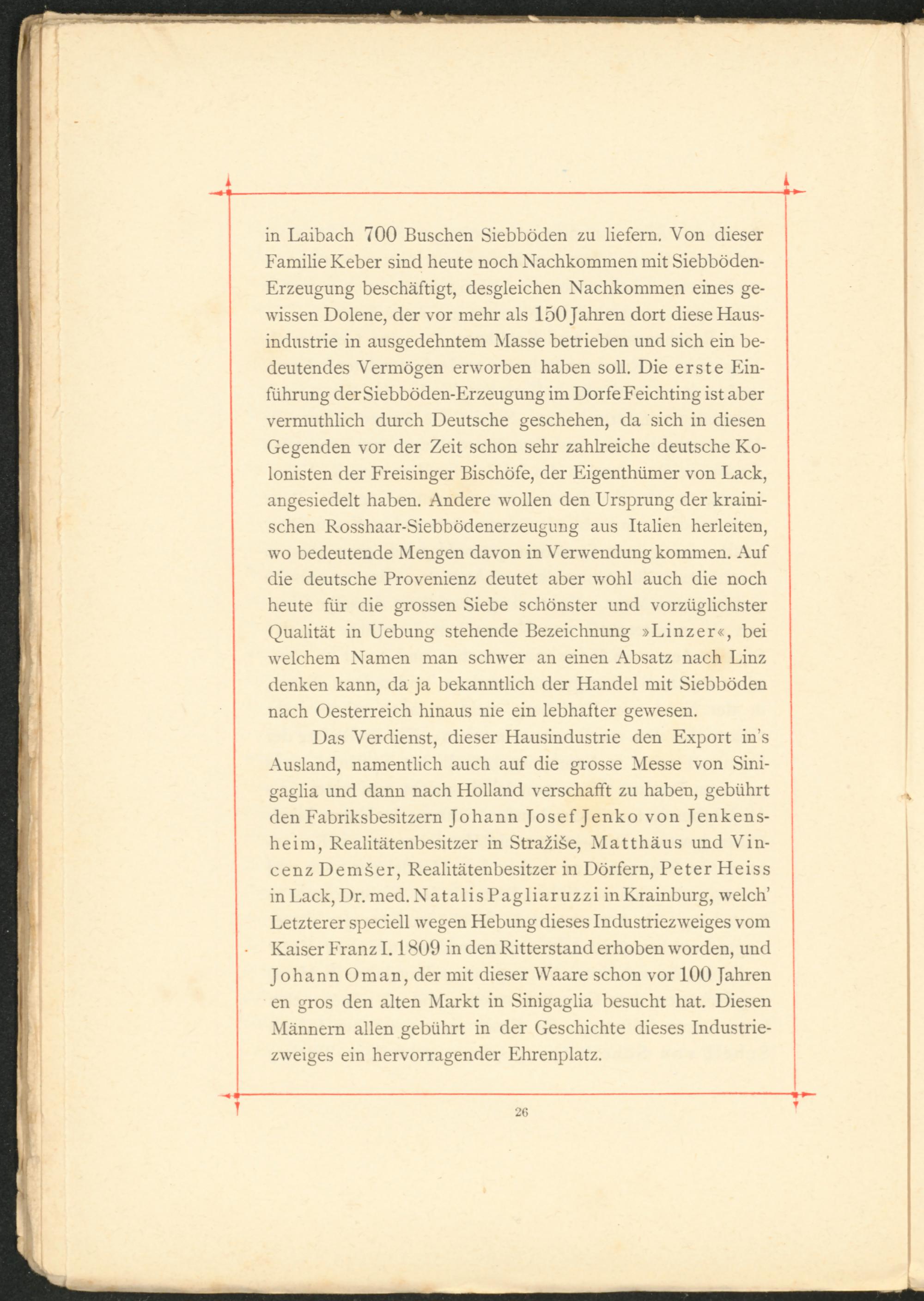 Das Verdienst, dieser Hausindustrie den Export in’s Ausland, namentlich auch auf die grosse Messe von Sini- gaglia und dann nach Holland verschafft zu haben, gebührt den Fabriksbesitzem Johann Josef Jenko von Jenkens- heim, Realitätenbesitzer in Straziäe, Matthäus und Vin- cenzDemäer, Realitätenbesitzer in Dörfern, Peter Heiss in Lack, Dr. med. NatalisPagliaruzzi inKrainburg, welch’ Letzterer speciell wegen Hebung dieses Industriezweiges vom Kaiser Franz 1.1809 in den Ritterstand erhoben worden, und Johann Oman, der mit dieser Waare schon vor 100 Jahren en gros den alten Markt in Sinigaglia besucht hat. Diesen Männern allen gebührt in der Geschichte dieses Industriezweiges ein hervorragender Ehrenplatz.