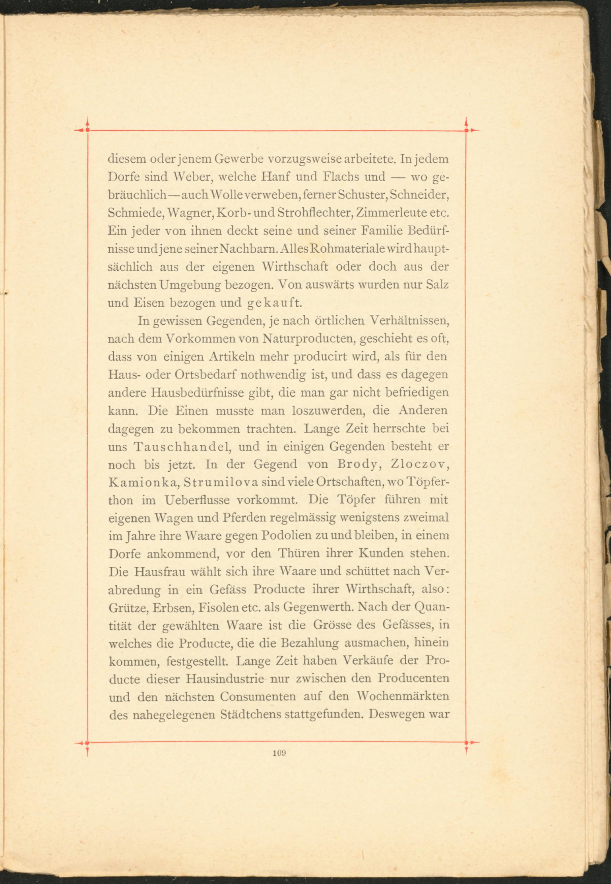 In gewissen Gegenden, je nach örtlichen Verhältnissen, nach dem Vorkommen von Naturproducten, geschieht es oft, dass von einigen Artikeln mehr producirt wird, als für den Haus- oder Ortsbedarf nothwendig ist, und dass es dagegen andere Hausbedürfnisse gibt, die man gar nicht befriedigen kann. Die Einen musste man loszuwerden, die Anderen dagegen zu bekommen trachten. Lange Zeit herrschte bei uns Tauschhandel, und in einigen Gegenden besteht er noch bis jetzt. In der Gegend von Brody, Zloczov, Kamionka, Strumilova sind viele Ortschaften, wo T öpfer- thon im Ueberflusse vorkommt. Die Töpfer führen mit eigenen Wagen und Pferden regelmässig wenigstens zweimal im Jahre ihre Waare gegen Podolien zu und bleiben, in einem Dorfe ankommend, vor den Thüren ihrer Kunden stehen. Die Hausfrau wählt sich ihre Waare und schüttet nach Verabredung in ein Gefäss Producte ihrer Wirthschaft, also: Grütze, Erbsen, Fisolen etc. als Gegenwerth. Nach der Quantität der gewählten Waare ist die Grösse des Gefässes, in welches die Producte, die die Bezahlung ausmachen, hinein kommen, festgestellt. Lange Zeit haben Verkäufe der Producte dieser Hausindustrie nur zwischen den Producenten und den nächsten Consumenten auf den Wochenmärkten des nahegelegenen Städtchens stattgefunden. Deswegen war