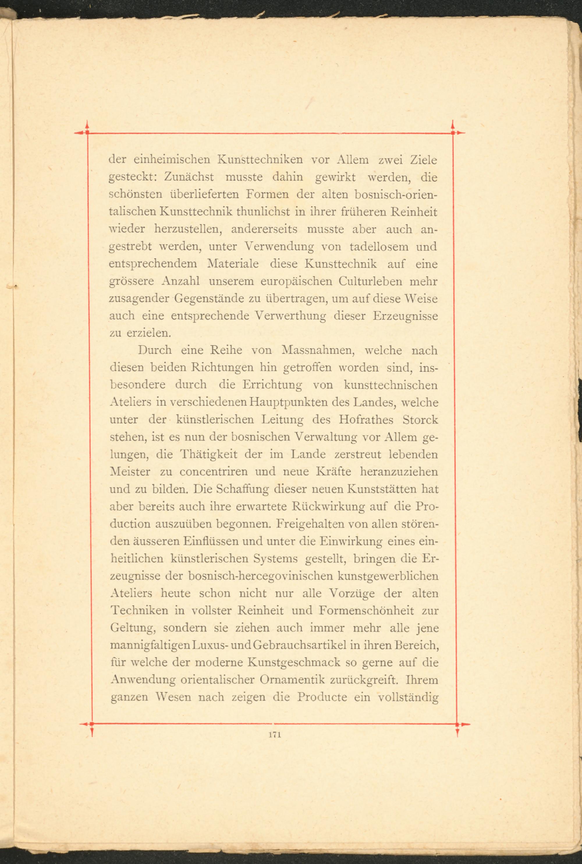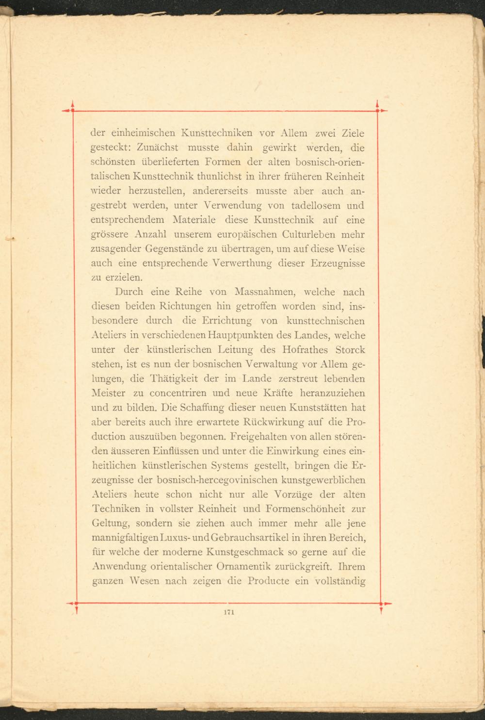 Durch eine Reihe von Massnahmen, welche nach diesen beiden Richtungen hin getroffen worden sind, ins­besondere durch die Errichtung von kunsttechnischen Ateliers in verschiedenen Hauptpunkten des Landes, welche unter der künstlerischen Leitung des Hofrathes Storck stehen, ist es nun der bosnischen Verwaltung vor Allem ge­lungen, die Thätigkeit der im Lande zerstreut lebenden Meister zu concentriren und neue Kräfte heranzuziehen und zu bilden. Die Schaffung dieser neuen Kunststätten hat aber bereits auch ihre erwartete Rückwirkung auf die Pro­duction auszuüben begonnen. Freigehalten von allen stören­den äusseren Einflüssen und unter die Einwirkung eines ein­heitlichen künstlerischen Systems gestellt, bringen die Er­zeugnisse der bosnisch-hercegovinischen kunstgewerblichen Ateliers heute schon nicht nur alle Vorzüge der alten Techniken in vollster Reinheit und Formenschönheit zur Geltung, sondern sie ziehen auch immer mehr alle jene mannigfaltigen Luxus-und Gebrauchsartikel in ihren Bereich, für welche der moderne Kunstgeschmack so gerne auf die Anwendung orientalischer Ornamentik zurückgreift. Ihrem ganzen Wesen nach zeigen die Producte ein vollständig