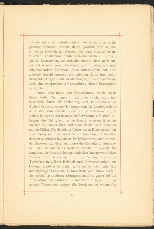 der einheimischen Kunsttechniken vor Allem zwei Ziele gesteckt: Zunächst musste dahin gewirkt werden, die schönsten überlieferten Formen der alten bosnisch-orien­talischen Kunsttechnik thunlichst in ihrer früheren Reinheit wieder herzustellen, andererseits musste aber auch an­gestrebt werden, unter Verwendung von tadellosem und entsprechendem Materiale diese Kunsttechnik auf eine grössere Anzahl unserem europäischen Culturleben mehr zusagender Gegenstände zu übertragen, um auf diese Weise auch eine entsprechende Verwerthung dieser Erzeugnisse zu erzielen.