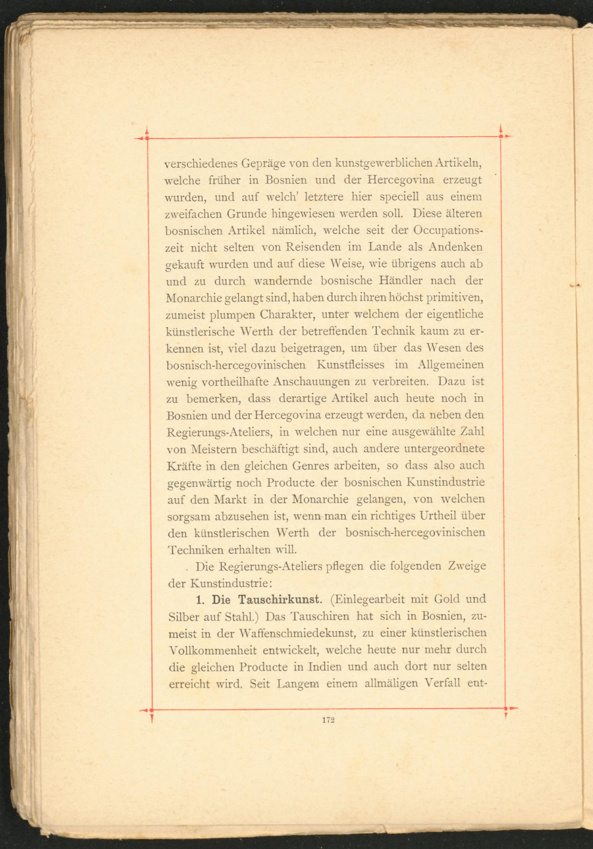 1. Die Tauschirkunst. (Einlegearbeit mit Gold und Silber auf Stahl.) Das Tauschiren hat sich in Bosnien, zumeist in der Waffenschmiedekunst, zu einer künstlerischen Vollkommenheit entwickelt, welche heute nur mehr durch die gleichen Producte in Indien und auch dort nur selten erreicht wird. Seit Langem einem allmäligen Verfall ent-