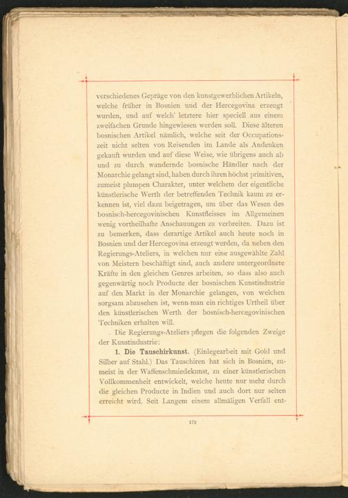 verschiedenes Gepräge von den kunstgewerblichen Artikeln, welche früher in Bosnien und der Hercegovina erzeugt wurden, und auf welch’ letztere hier speciell aus einem zweifachen Grunde hingewiesen werden soll. Diese älteren bosnischen Artikel nämlich, welche seit der Occupations- zeit nicht selten von Reisenden im Lande als Andenken gekauft wurden und auf diese Weise, wie übrigens auch ab und zu durch wandernde bosnische Händler nach der Monarchie gelangt sind, haben durch ihren höchst primitiven, zumeist plumpen Charakter, unter welchem der eigentliche künstlerische Werth der betreffenden Technik kaum zu erkennen ist, viel dazu beigetragen, um über das Wesen des bosnisch-hercegovinischen Kunstfleisses im Allgemeinen wenig vortheilhafte Anschauungen zu verbreiten. Dazu ist zu bemerken, dass derartige Artikel auch heute noch in Bosnien und der Hercegovina erzeugt werden, da neben den Regierungs-Ateliers, in welchen nur eine ausgewählte Zahl von Meistern beschäftigt sind, auch andere untergeordnete Kräfte in den gleichen Genres arbeiten, so dass also auch gegenwärtig noch Producte der bosnischen Kunstindustrie auf den Markt in der Monarchie gelangen, von welchen sorgsam abzusehen ist, wenn man ein richtiges Urtheil über den künstlerischen Werth der bosnisch-hercegovinischen Techniken erhalten will.