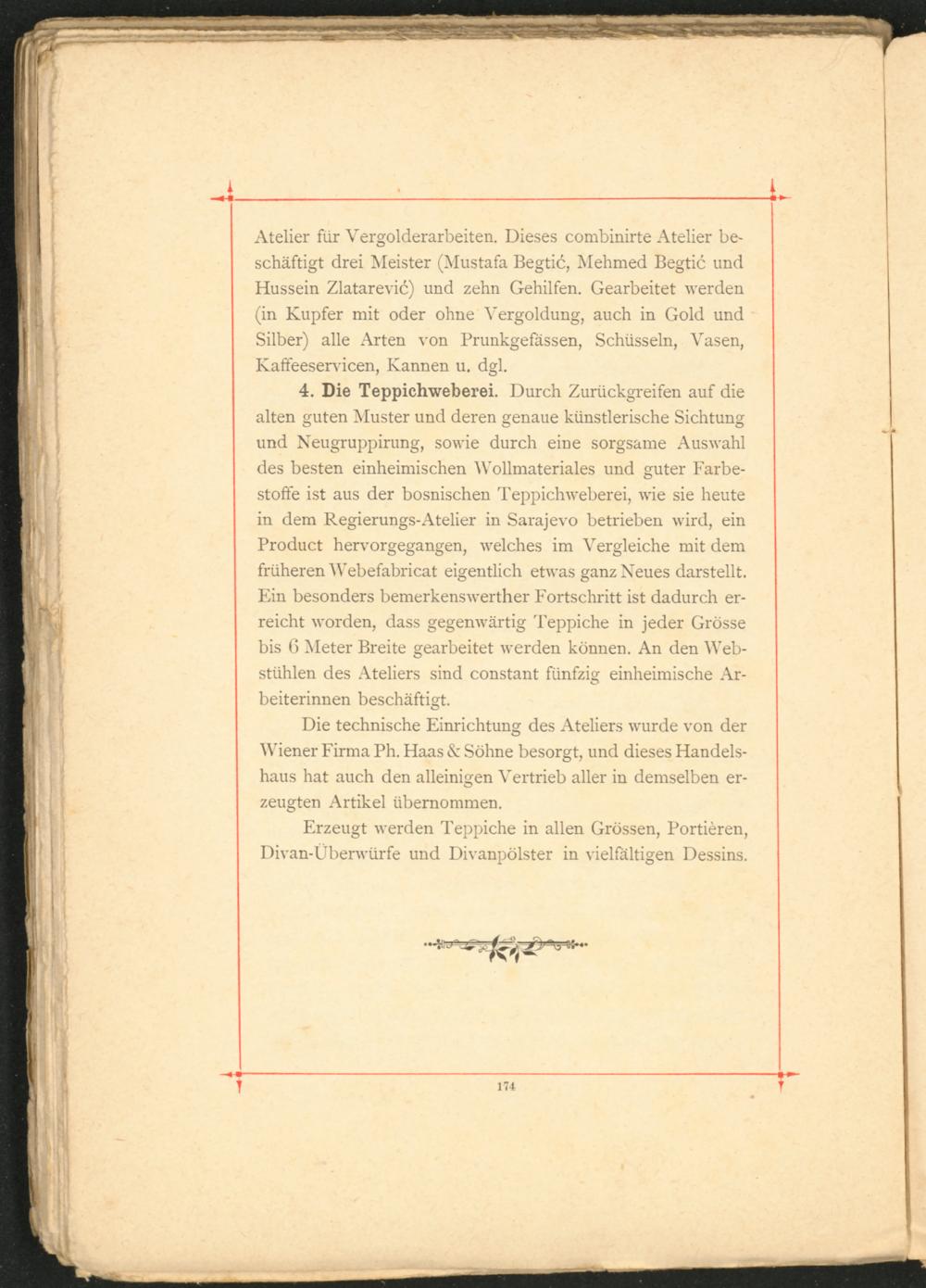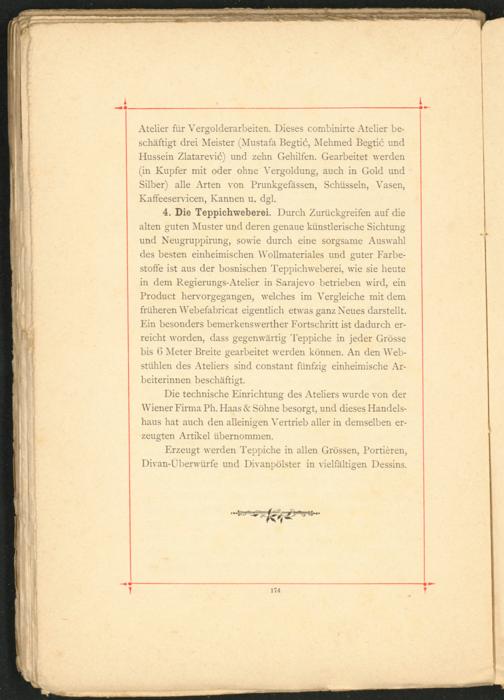 Atelier für Vergolderarbeiten. Dieses combinirte Atelier beschäftigt drei Meister (Mustafa Begtic, Mehmed Begtic und Hussein Zlatarevic) und zehn Gehilfen. Gearbeitet werden (in Kupfer mit oder ohne Vergoldung, auch in Gold und Silber) alle Arten von Prunkgefässen, Schüsseln, Vasen, Kafteeservicen, Kannen u. dgl.