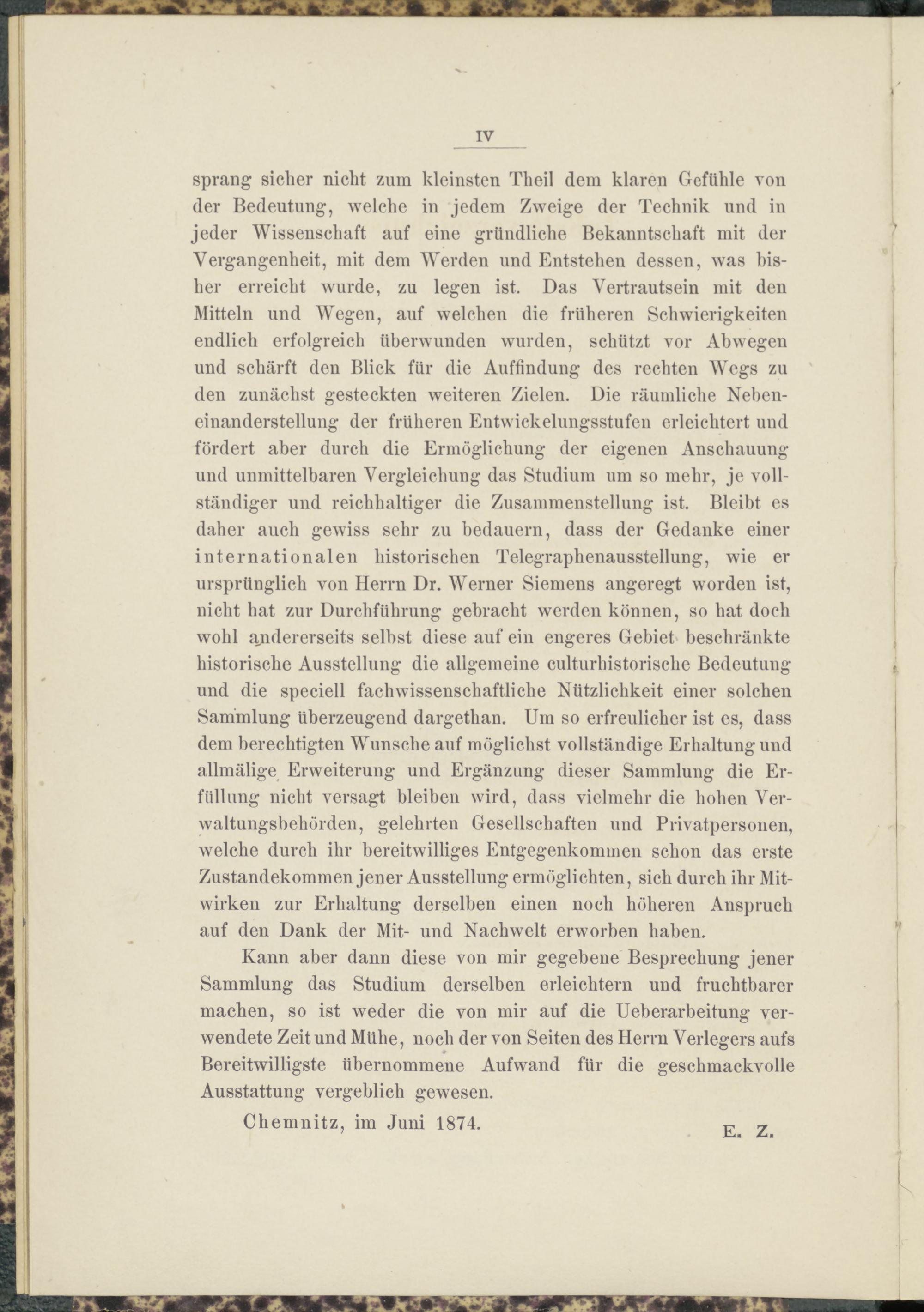 sprang sicher nicht zum kleinsten Th eil dem klaren Gefühle von der Bedeutung, welche in jedem Zweige der Technik und in jeder Wissenschaft auf eine gründliche Bekanntschaft mit der Vergangenheit, mit dem Werden und Entstehen dessen, was bisher erreicht wurde, zu legen ist. Das Vertrautsein mit den Mitteln und Wegen, auf welchen die früheren Schwierigkeiten endlich erfolgreich überwunden wurden, schützt vor Abwegen und schärft den Blick für die Auffindung des rechten Wegs zu den zunächst gesteckten weiteren Zielen. Die räumliche Nebeneinanderstellung der früheren Entwickelungsstufen erleichtert und fördert aber durch die Ermöglichung der eigenen Anschauung und unmittelbaren Vergleichung das Studium um so mehr, je vollständiger und reichhaltiger die Zusammenstellung ist. Bleibt es daher auch gewiss sehr zu bedauern, dass der Gedanke einer internationalen historischen Telegraphenausstellung, wie er ursprünglich von Herrn Dr. Werner Siemens angeregt worden ist, nicht hat zur Durchführung gebracht werden können, so hat doch wohl andererseits selbst diese auf ein engeres Gebiet' beschränkte historische Ausstellung die allgemeine culturhistorische Bedeutung und die speciell fachwissenschaftliche Nützlichkeit einer solchen Sammlung überzeugend dargethan. Um so erfreulicher ist es, dass dem berechtigten Wunsche auf möglichst vollständige Erhaltung und allmälige Erweiterung und Ergänzung dieser Sammlung die Erfüllung nicht versagt bleiben w 7 ird, dass vielmehr die hohen Verwaltungsbehörden, gelehrten Gesellschaften und Privatpersonen, welche durch ihr bereitwilliges Entgegenkommen schon das erste Zustandekommen jener Ausstellung ermöglichten, sich durch ihr Mitwirken zur Erhaltung derselben einen noch höheren Anspruch auf den Dank der Mit- und Nachwelt erworben haben.