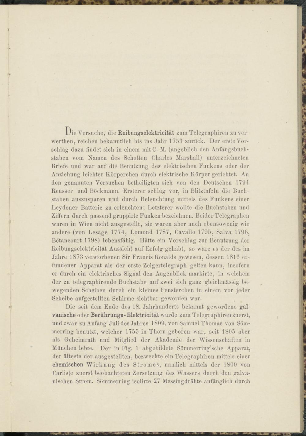 Die seit dem Ende des 18. Jahrhunderts bekannt gewordene galvanische oder Berührungs-Elektricität wurde zum Telegraphiren zuerst, und zwar zu Anfang Juli des Jahres 1809, von Samuel Thomas von Söm- merring benutzt, welcher 1755 in Thorn geboren war, seit 1805 aber als Geheimrath und Mitglied der Akademie der Wissenschaften in München lebte. Der in Fig. 1 abgebildete Sömmerring’sche Apparat, der älteste der ausgestellten, bezweckte ein Telegraphiren mittels einer chemischen Wirkung des Stromes, nämlich mittels der 1800 von Carlisle zuerst beobachteten Zersetzung des Wassers durch den galvanischen Strom. Sömmerring isolirte 27 Messingdrähte anfänglich durch