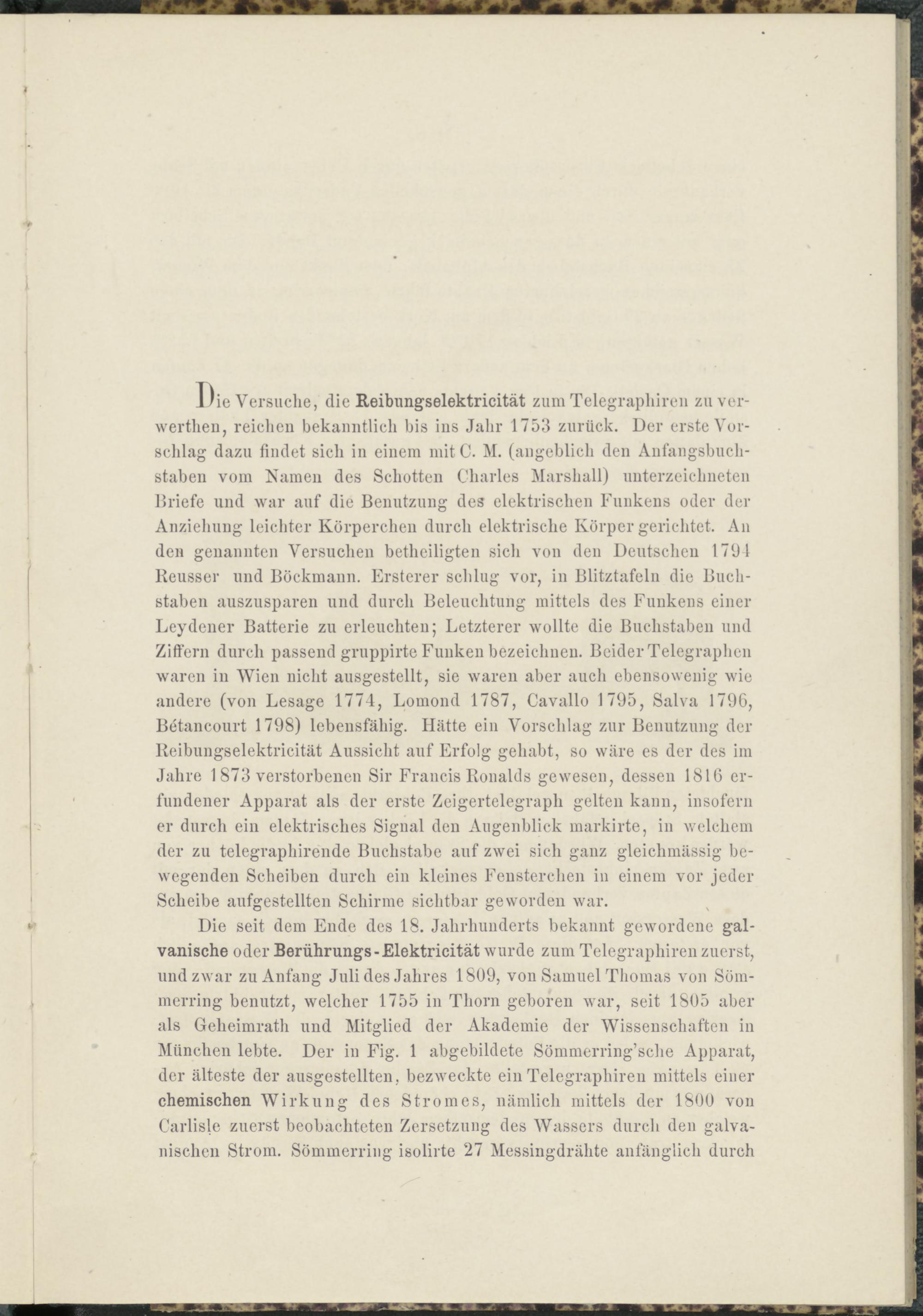 1'ie Versuche, die Reibungselektricität zum Telegraphiren zuver- wertlien, reiclien bekanntlich bis ins Jahr 1753 zurück. Der erste Verschlag dazu findet sich in einem mitC. M. (angeblich den Anfangsbuchstaben vom Namen des Schotten Charles Marshall) Unterzeichneten Briefe und war auf die Benutzung des elektrischen Funkens oder der Anziehung leichter Körperchen durch elektrische Körper gerichtet. An den genannten Versuchen betheiligten sich von den Deutschen 1791 Reusser und Böckmann. Ersterer schlug vor, in Blitztafeln die Buchstaben auszusparen und durch Beleuchtung mittels des Funkens einer Leydener Batterie zu erleuchten; Letzterer wollte die Buchstaben und Ziffern durch passend gruppirte Funken bezeichnen. Beider Telegraphen waren in Wien nicht ausgestellt, sie waren aber auch ebensowenig wie andere (von Besage 1774, Lomond 1787, Cavallo 1795, Salva 1796, Betancourt 1798) lebensfähig. Hätte ein Vorschlag zur Benutzung der Reibungselektricität Aussicht auf Erfolg gehabt, so wäre es der des im Jahre 1 873 verstorbenen Sir Francis Ronalds gewesen, dessen 1816 erfundener Apparat als der erste Zeigertelegraph gelten kann, insofern er durch ein elektrisches Signal den Augenblick markirte, in welchem der zu telegraphirende Buchstabe auf zwei sich ganz gleichmässig bewegenden Scheiben durch ein kleines Fensterchen in einem vor jeder Scheibe aufgestellten Schirme sichtbar geworden war.