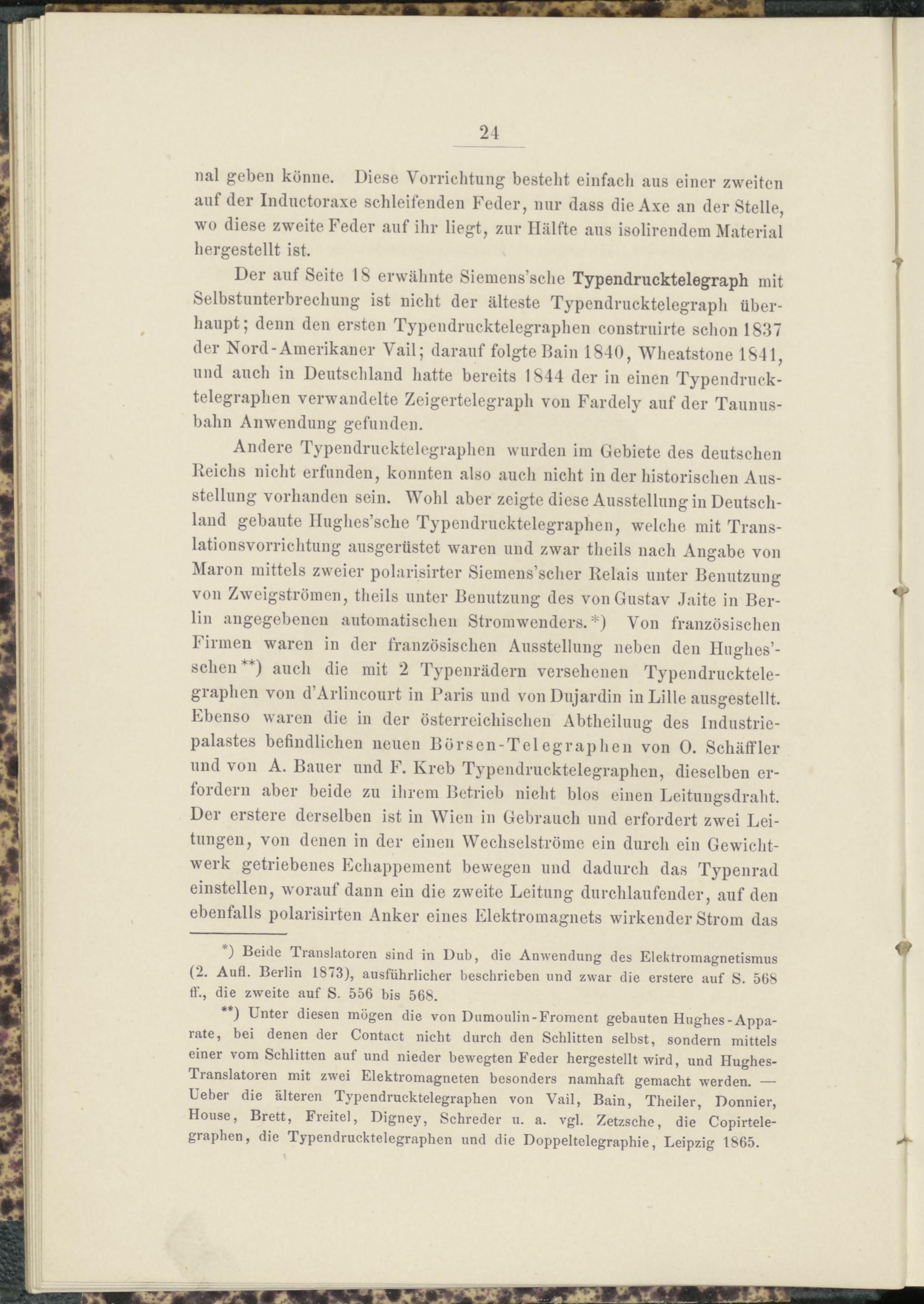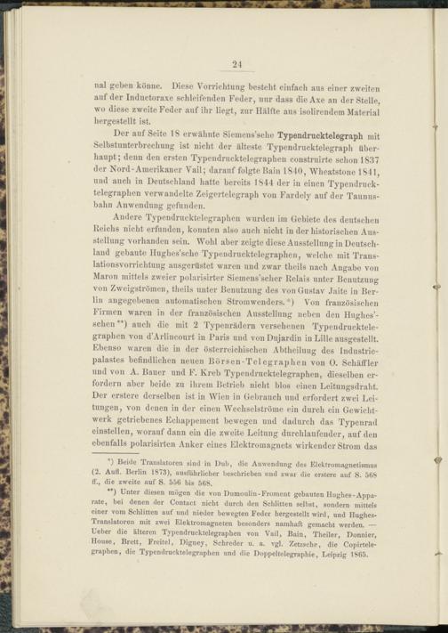 Der auf Seite 18 erwähnte Siemens’sche Typendrucktelegraph mit Selbstunterbrechung ist nicht der älteste Typendrucktelegraph überhaupt; denn den ersten Typendrucktelegraphen construirte schon 1837 der Nord-Amerikaner Vail; darauf folgte Bain 1840, Wheatstone 1841, und auch in Deutschland hatte bereits 1844 der in einen Typendrucktelegraphen verwandelte Zeigertelegraph von Fardely auf der Taunusbahn Anwendung gefunden.