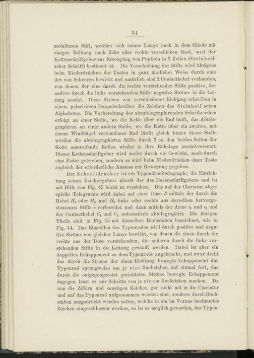 Der Schnelldrucker ist ein Typendrucktelegraph; die Einrichtung seines Zeichengebers ähnelt der des Dosenschriftgebers und ist mit Hilfe von Fig. 45 leicht zu verstehen. Das auf der Claviatur abgespielte Telegramm wird dabei auf einer Dose D mittels der durch die Hebel II t oder H. 2 und // 3 links oder rechts aus derselben hervorge- stossenen Stifte .v vorbereitet und dann mittels der Arme und i 2 und der Contacthebel C\ und C 2 automatisch abtelegraphirt. Die übrigen Theile sind in Fig. 45 mit denselben Buchstaben bezeichnet, wie in Fig. 44. Das Einstellen des Typenrades wird durch positive und negative Ströme von gleicher Länge bewirkt, von denen die einen durch die rechts aus der Dose vorstehenden, die anderen durch die links vorstehenden Stifte in die Leitung gesandt werden. Dabei ist aber ein doppeltes Echappement an dem Typenrade angebracht, und zwar dreht das durch die Ströme der einen Richtung bewegte Echappement das Typenrad sprungweise um je vier Buchstaben auf einmal fort, das durch die entgegengesetzt gerichteten Ströme bewegte Echappement dagegen lässt es nur Schritte von je einem Buchstaben machen. Da nun die Ziffern und sonstigen Zeichen gar nicht mit in die Claviatur und auf das Typenrad aufgenommen worden sind, sondern durch Buchstaben ausgedrückt werden sollen, welche in ein im Voraus bestimmtes Zeichen eingeschlossen werden, so ist es möglich geworden, das Typen-