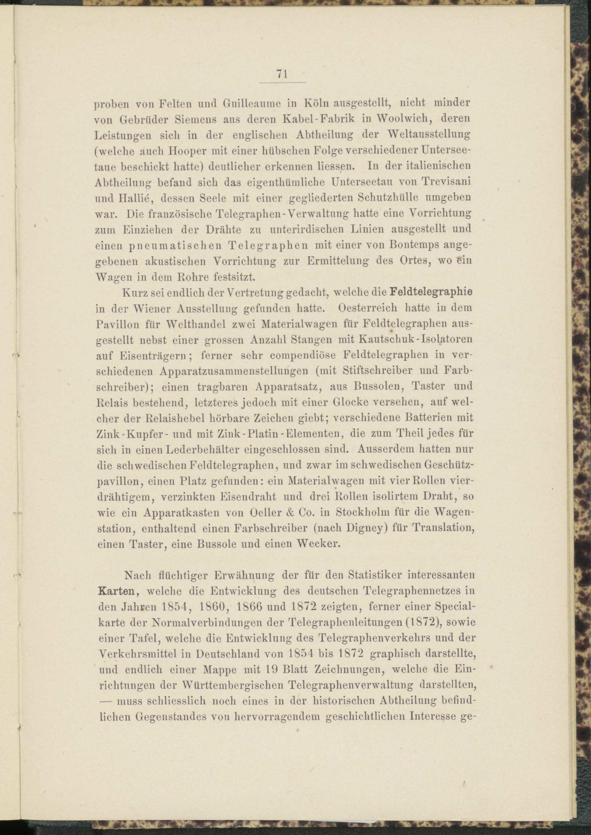 proben von Felten und Guilleaume in Köln ausgestellt, nicht minder von Gebrüder Siemens aus deren Kabel-Fabrik in Woolwich, deren Leistungen sich in der englischen Abtheilung der Weltausstellung (welche auch Hooper mit einer hübschen Folge verschiedener Unterseetaue beschickt hatte) deutlicher erkennen Hessen. In der italienischen Abtheilung befand sich das eigenthümliche Unterseetau von Trevisani und Halbe, dessen Seele mit einer gegliederten Schutzhülle umgeben war. Die französische Telegraphen-Verwaltung hatte eine Vorrichtung zum Einziehen der Drähte zu unterirdischen Linien ausgestellt und einen pneumatischen Telegraphen mit einer von Bontemps angegebenen akustischen Vorrichtung zur Ermittelung des Ortes, wo ein Wagen in dem Rohre festsitzt.