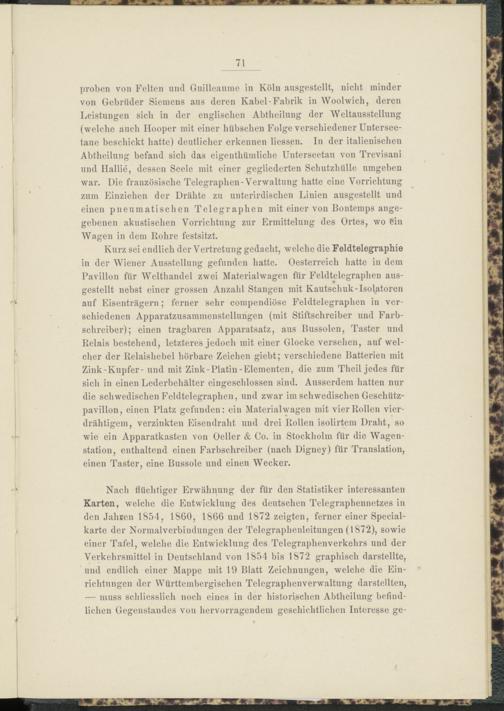 Nach flüchtiger Erwähnung der für den Statistiker interessanten Karten, welche die Entwicklung des deutschen Telegraphennetzes in den Jahren 1854, 1860, 1866 und 1872 zeigten, ferner einer Specialkarte der Normalverbindungen der Telegraphenleitungen (1872), sowie einer Tafel, welche die Entwicklung des Telegraphenverkehrs und der Verkehrsmittel in Deutschland von 1854 bis 1872 graphisch darstellte, und endlich einer Mappe mit 19 Blatt Zeichnungen, welche die Einrichtungen der Württembergischen Telegraphenverwaltung darstellten, — muss schliesslich noch eines in der historischen Abtheilung befindlichen Gegenstandes von hervorragendem geschichtlichen Interesse ge-