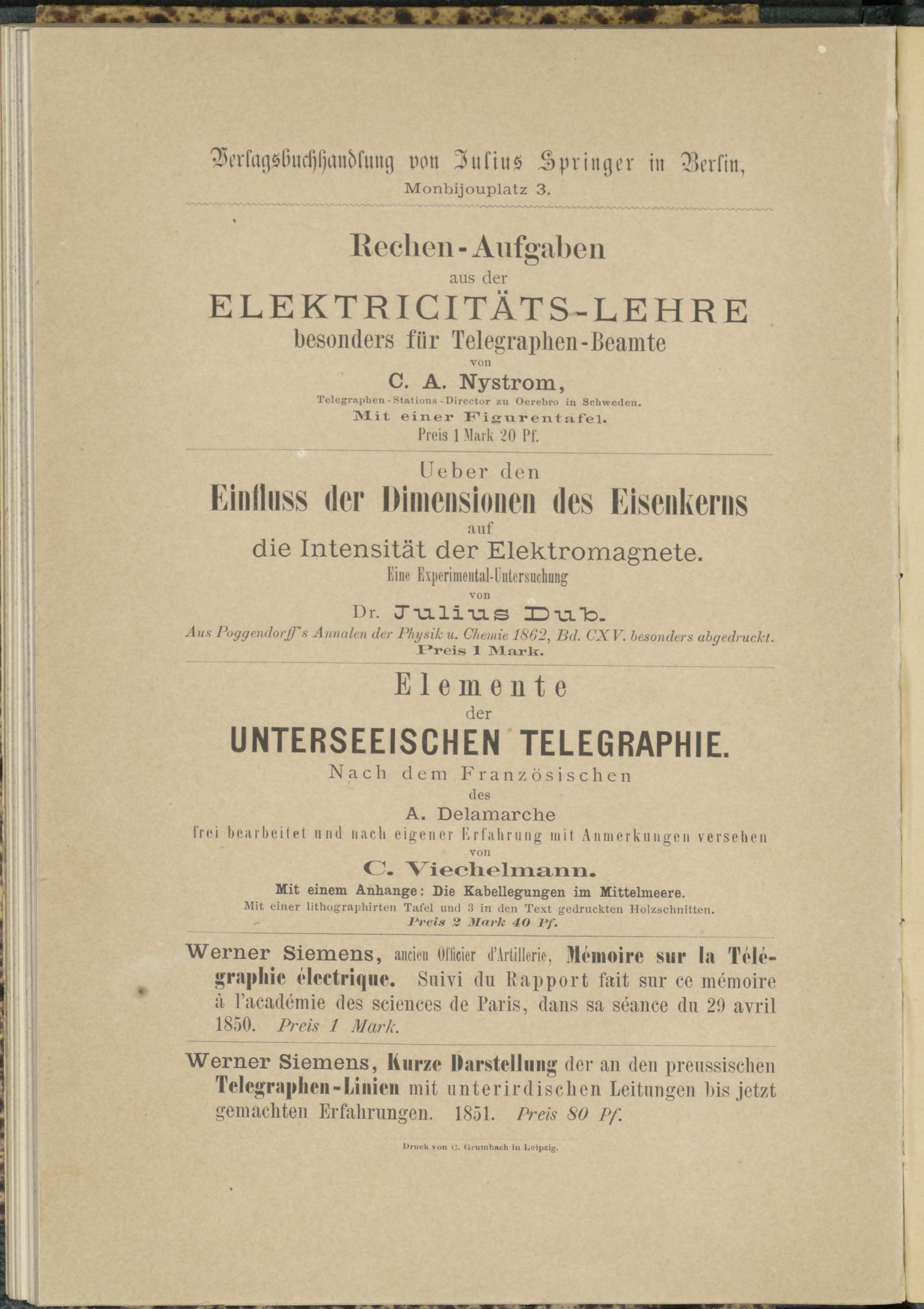 Werner Siemens, aneicu Oilicier d’Artilleric, llemoire sur la Telegraphie electrique. Suivi du Rapport fait sur ce memoire ä l’academie des sciences de Paris, dans sa seance du 29 avril 1850. Preis 1 Mark.