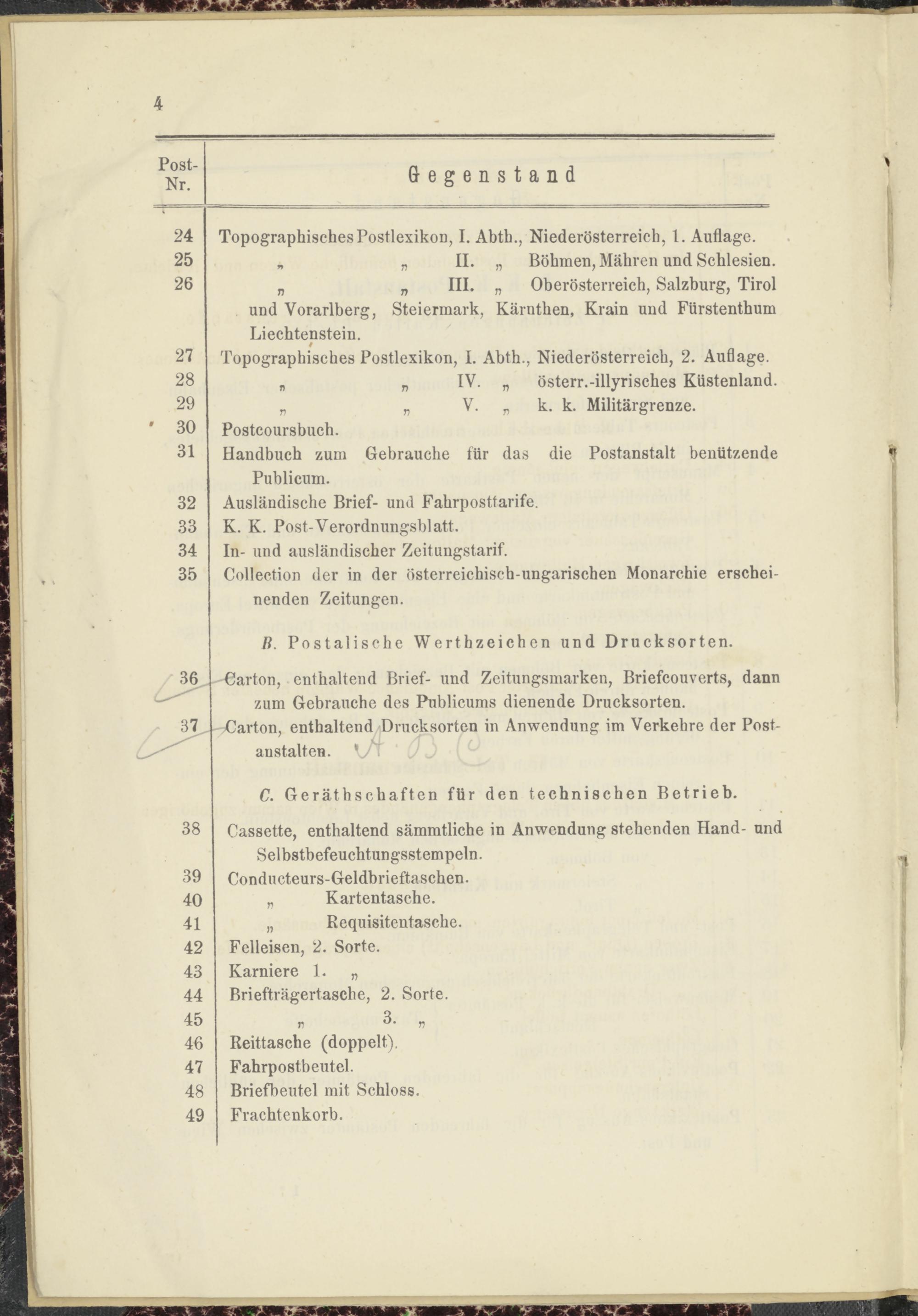 36 J Carton, enthaltend Brief- und Zeitungsmarken, Briefcouverts, dann zum Gebrauche des Pnblicums dienende Drucksorten. yr 37^|-HCarton, enthaltend/iDrucksorten in Anwendung im Verkehre der Post-