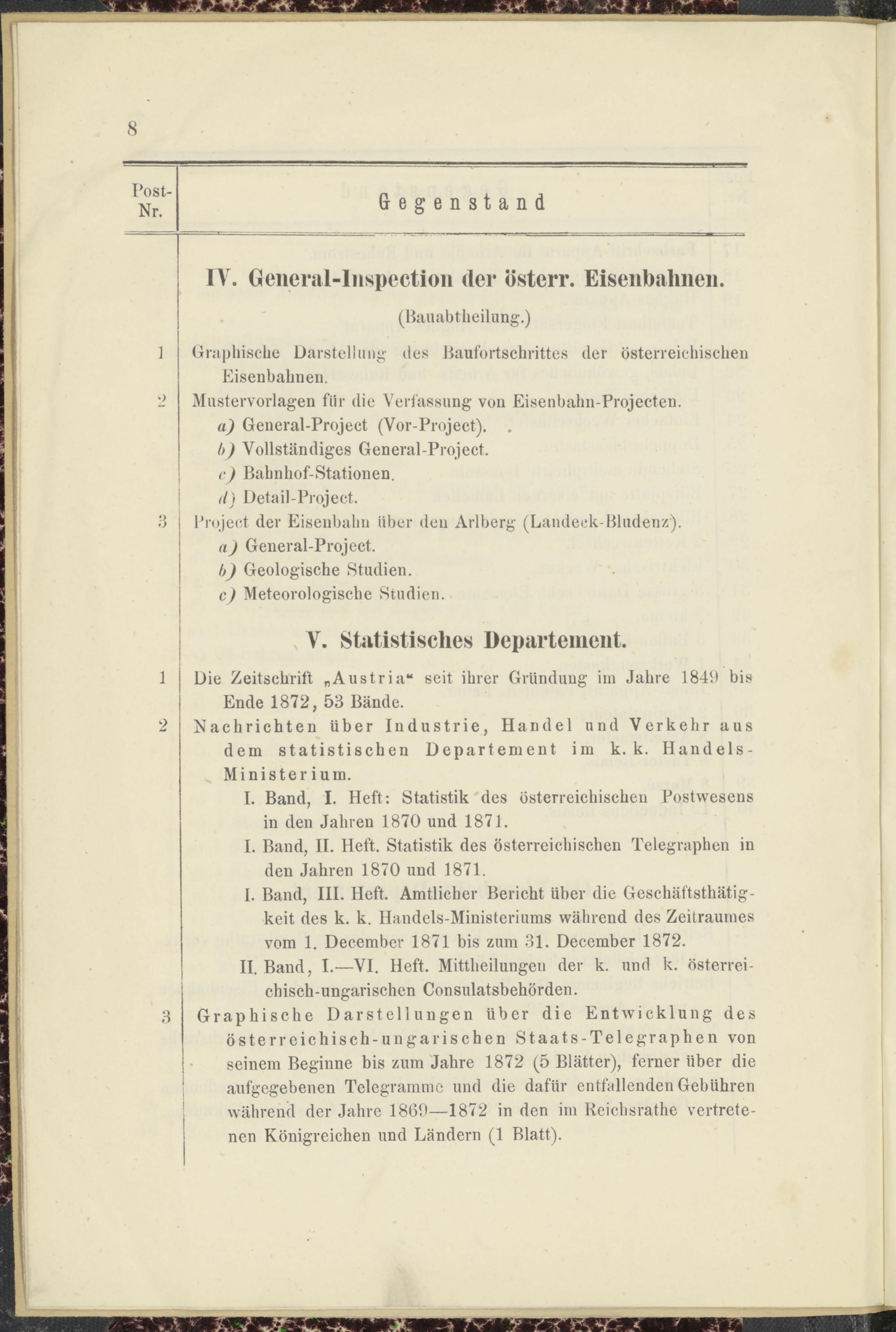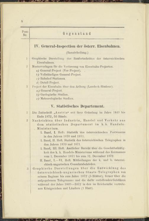 Graphische Darstellungen über die Entwicklung des österreichisch-ungarischen Staats-Telegraphen von seinem Beginne bis zum Jahre 1872 (5 Blätter), ferner über die aufgegebenen Telegramme und die dafür entfallenden Gebühren während der Jahre 1869—1872 in den im Reichsrathc vertretenen Königreichen und Ländern (1 Blatt).