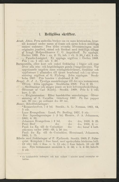 Arndt . Johan , Fyra anderika böcker om en sann kristendom, hvar- till kommer under namn af feinte och sjette boken ätskilliga smärre traktater. Den äldre svenska öfversättningen med • originalet jemförd, rättad och förökad med ätskilliga tillägg af kongl. Hofpredikanten C. 0. Angeldorff. Ny upplaga. Örebro 1868. Pris i ex. 2: 75, inb. i vb. 8: 50, i skb. 4 rdr.
