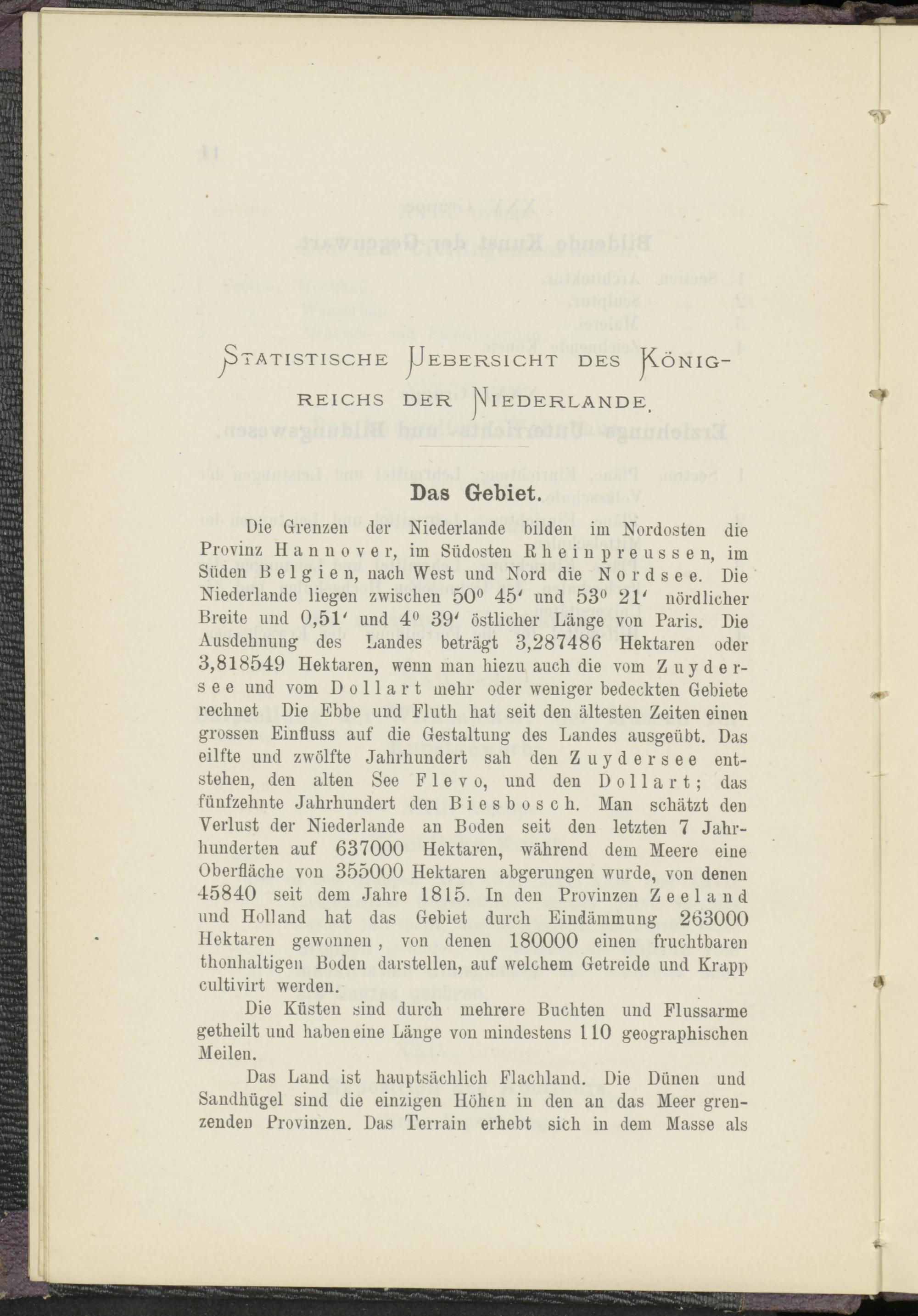 Die Grenzen der Niederlande bilden im Nordosten die Provinz Hannover, im Südosten Eheinpreussen, im Süden B e 1 g i e n, nach West und Nord die Nordsee. Die Niederlande liegen zwischen 50° 45' und 53° 21' nördlicher Breite und 0,51' und 4° 39' östlicher Länge von Paris. Die Ausdehnung des Landes beträgt 3,287486 Hektaren oder 3,818549 Hektaren, wenn man hiezu auch die vom Zuyder- s e e und vom Dollart mehr oder weniger bedeckten Gebiete rechnet Die Ebbe und Flutli hat seit den ältesten Zeiten einen grossen Einfluss auf die Gestaltung des Landes ausgeübt. Das eilfte und zwölfte Jahrhundert sah den Zuydersee entstehen, den alten See F1 e v o, und den Dollart; das fünfzehnte Jahrhundert den Biesbosch. Man schätzt den Verlust der Niederlande an Boden seit den letzten 7 Jahrhunderten auf 637000 Hektaren, während dem Meere eine Oberfläche von 355000 Hektaren abgerungen wurde, von denen 45840 seit dem Jahre 1815. In den Provinzen Zeel and und Holland hat das Gebiet durch Eindämmung 263000 Hektaren gewonnen , von denen 180000 einen fruchtbaren thonhaltigen Boden darstellen, auf welchem Getreide und Krapp cultivirt werden.