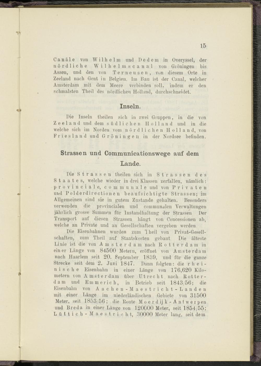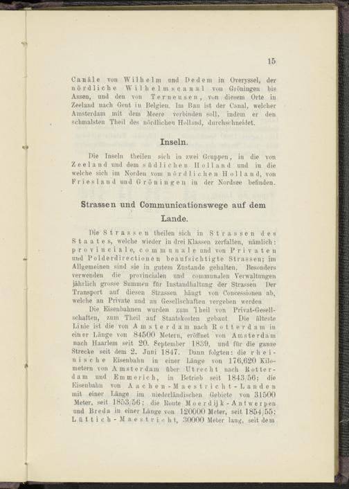 Die Eisenbahnen wurden zum r I heil von Privat-Gesell- schatten, zum Theil auf Staatskosten gebaut. Die älteste Linie ist die von Amsterdam nach Rotterdam in einer Länge von 84500 Metern, eröffnet von Amsterdam nach Haarlem seit 20. September 1859, und für die ganze Strecke seit dem 2. Juni 1847. Dann folgten: die rheinische Eisenbahn in einer Länge von 176,620 Kilometern v on A msterda m über Utrecht nach Rotterdam und Emmerich, in Betrieb seit 1843/56; die Eisenbahn von A a c li e n - M a e s t r i c h t - L a n d e n mit einer Länge im niederländischen Gebiete von 31500 Meter, seit 1853/56,' die Route M o e r d ij k - A n t w e r pen und Breda in einer Länge von 120000 Meter, seit 1854/55; L ü t t i c li - M a e s t r i c li t, 30000 Meter lang, seit dem