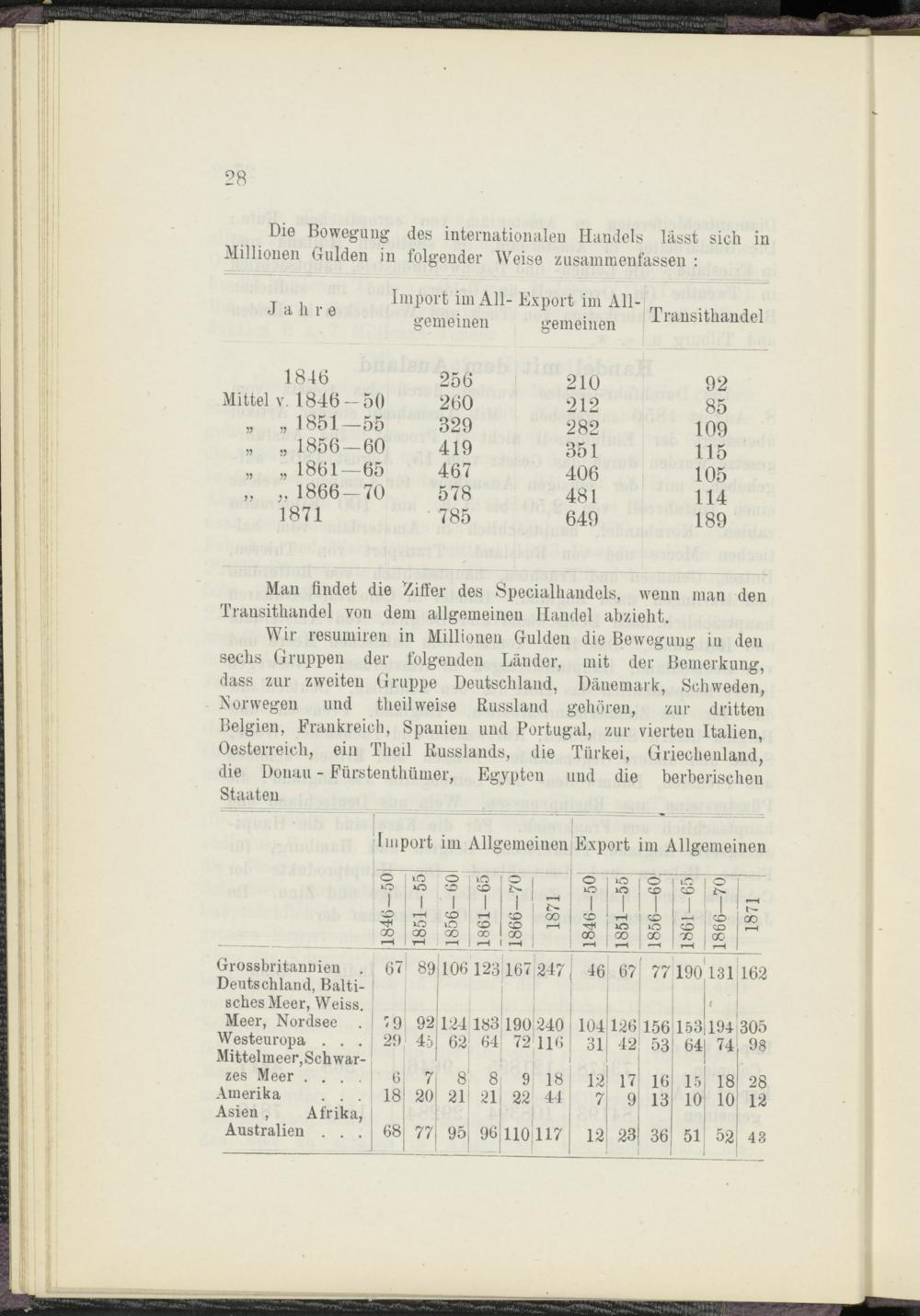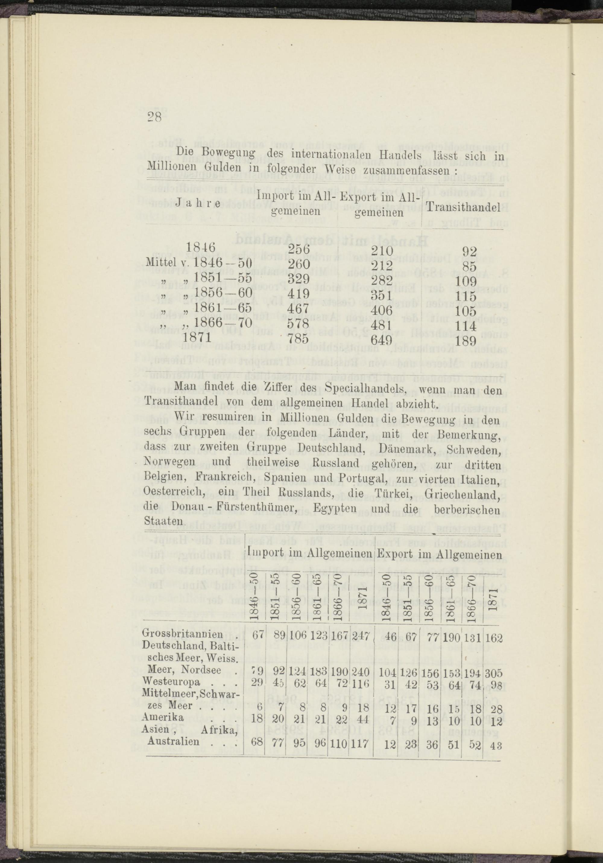 Wir resumiren in Millionen Gulden die Bewegung in den sechs Gruppen der folgenden Länder, mit der Bemerkung, dass zur zweiten Gruppe Deutschland, Dänemark, Schweden, Norwegen und theil weise Russland gehören, zur dritten Belgien, Frankreich, Spanien und Portugal, zur vierten Italien, Oesterreich, ein Theil Russlands, die Türkei, Griechenland, die Donau - Fürstenthümer, Egypten und die berberischen Staaten