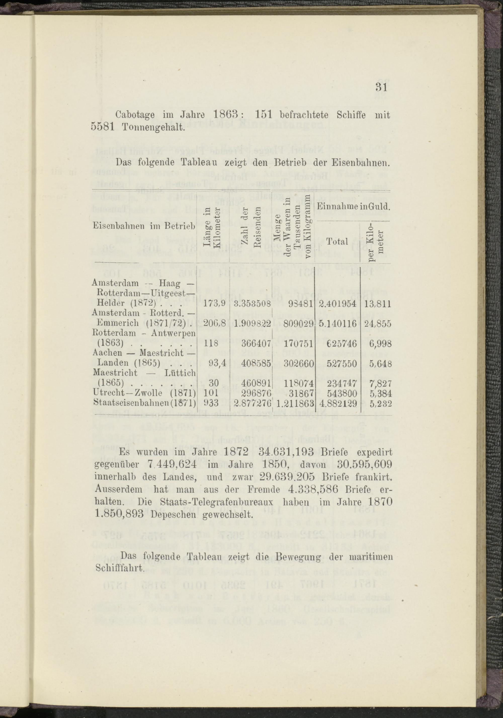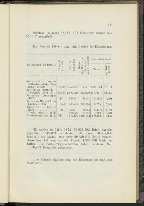 Es wurden im Jahre 1872 34.631,133 Briefe expedirt gegenüber 7 449,624 im Jahre 1850, davon 30.595,609 innerhalb des Landes, und zwar 29.639.205 Briefe frankirt. Ausserdem hat man aus der Fremde 4.338,586 Briefe erhalten. Die Staats-Telegrafenbureaux haben im Jahre 1870 1.850,893 Depeschen gewechselt.