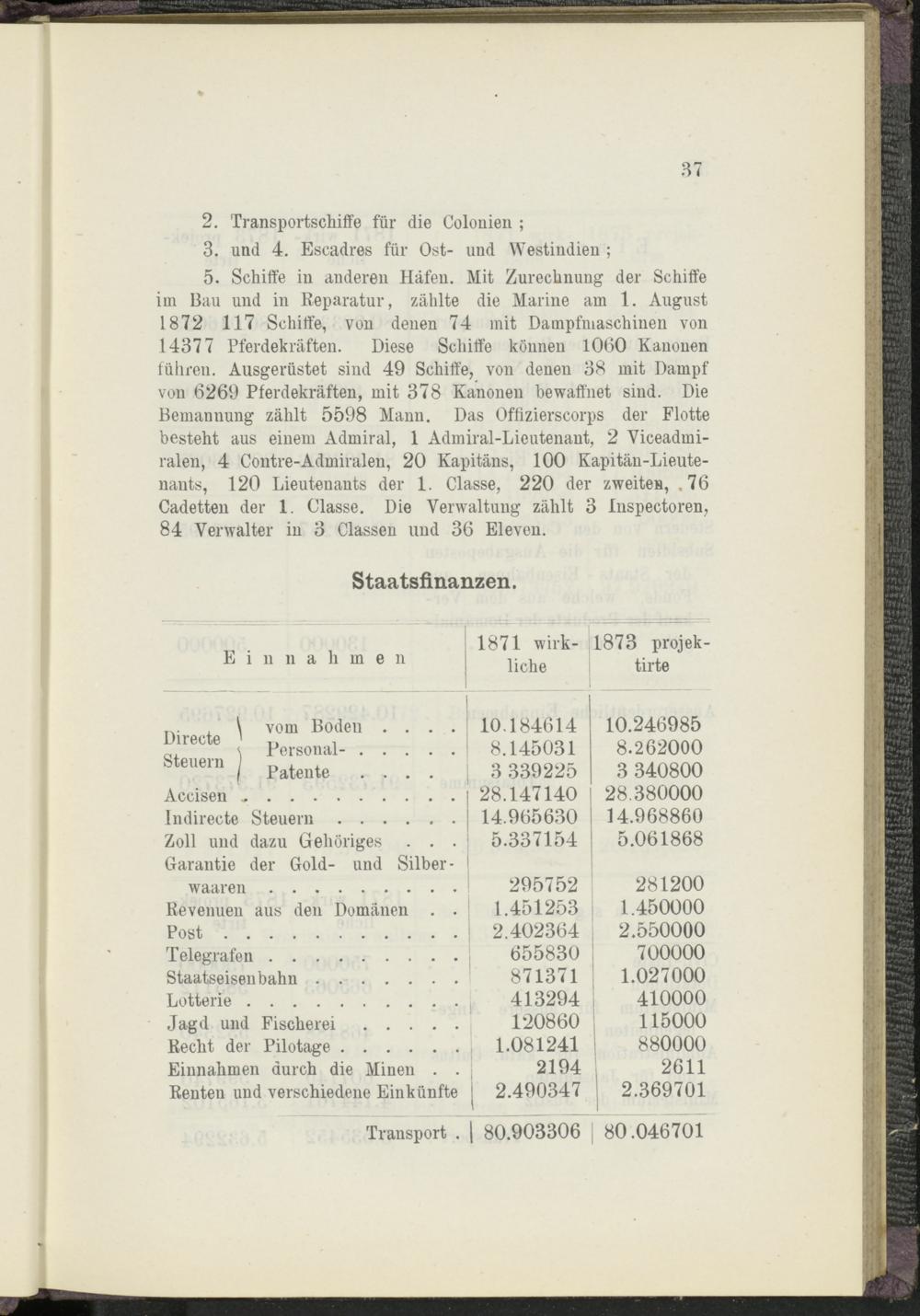 5. Schiffe in anderen Häfen. Mit Zurechnung der Schiffe im Bau und in Reparatur, zählte die Marine am 1. August 1872 117 Schiffe, von denen 74 mit Dampfmaschinen von 14377 Pferdekräften. Diese Schiffe können 1060 Kanonen führen. Ausgerüstet sind 49 Schiffe, von denen 38 mit Dampf von 6269 Pferdekräften, mit 378 Kanonen bewaffnet sind. Die Bemannung zählt 5598 Mann. Das Offizierscorps der Flotte besteht aus einem Admiral, 1 Admiral-Lieutenant, 2 Viceadmi- ralen, 4 Contre-Admiralen, 20 Kapitäns, 100 Kapitän-Lieutenants, 120 Lieutenants der 1. Classe, 220 der zweiten, .76 Cadetten der 1. Classe. Die Verwaltung zählt 3 Inspectoren, 84 Verwalter in 3 Classen und 36 Eleven.