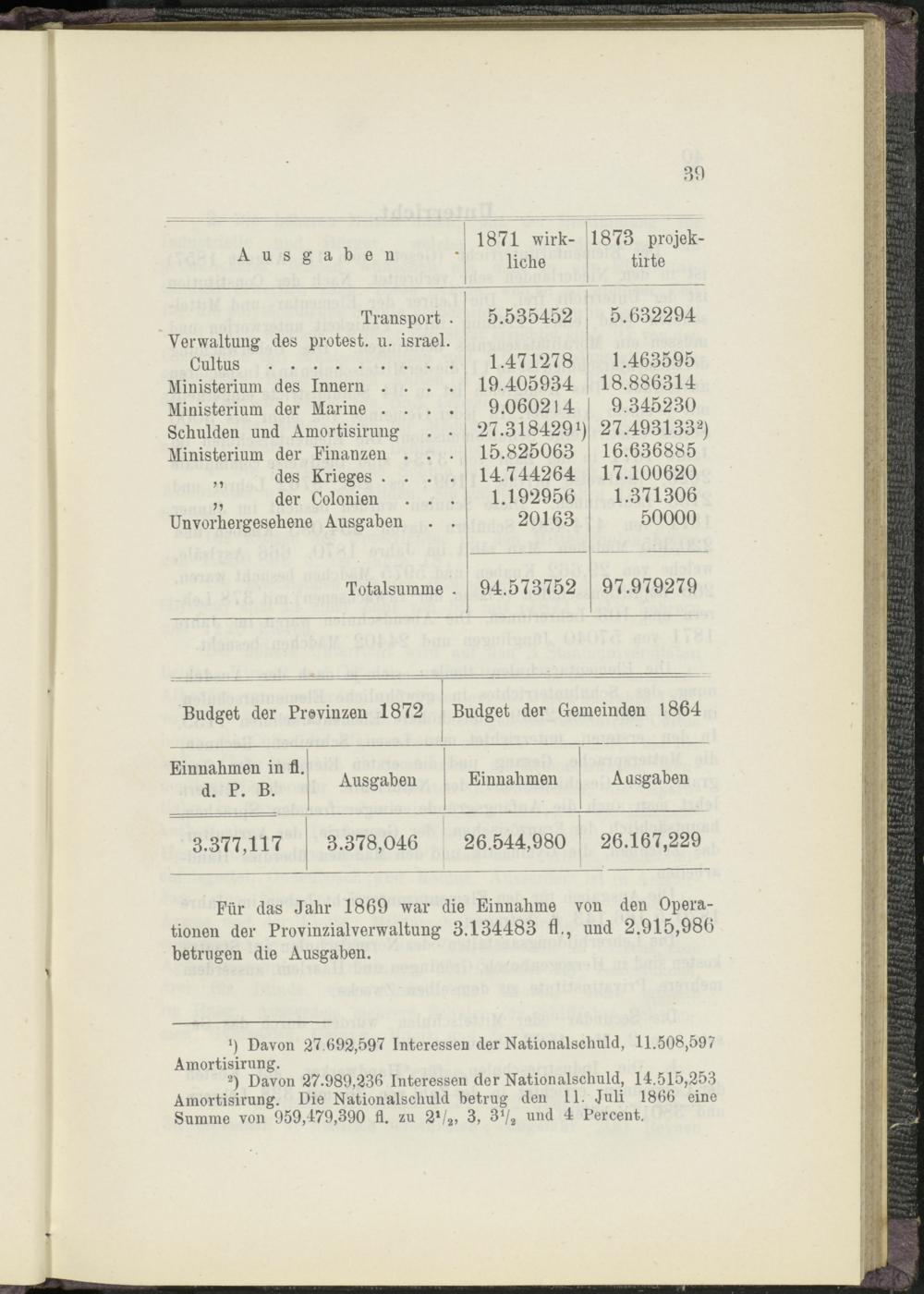 Für das Jahr 1869 war die Einnahme von den Operationen der Provinzialverwaltung 3.134483 fl., und 2.915,986 betrugen die Ausgaben.