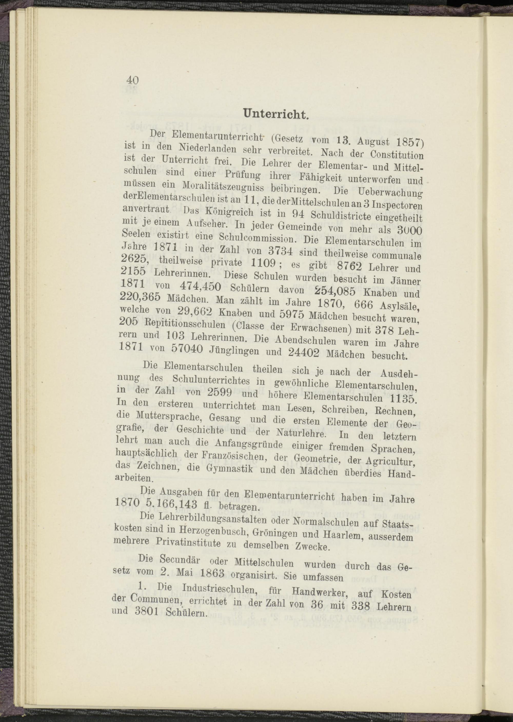 Der Elementarunterricht' (Gesetz vom 13. August 1857) ist in den Niederlanden sehr verbreitet. Nach der Constitution ist der Unterricht frei. Die Lehrer der Elementar- und Mittelschulen sind einer Prüfung ihrer Fähigkeit unterworfen und müssen ein Moralitätszeugniss beibriugen. Die Ueberwachung derElementarschulen ist au 11, die derMittelschulen an 3 Inspectoren anvertraut Das Königreich ist in 94 Schuldistricte eingetheilt mit je einem Aufseher. In jeder Gemeinde von mehr als 3000 Seelen existirt eine Schulcommission. Die Elementarschulen im Jahre 1871 in der Zahl von 3734 sind theilweise communale 2625, theilweise private 1109 ; es gibt 8762 Lehrer und 2155 Lehrerinnen. Diese Schulen wurden besucht im Jänner 1871 von 474,450 Schülern davon 254,085 Knaben und 220,365 Mädchen. Man zählt im Jahre 1870, 666 Asylsäle, welche von 29,662 Knaben und 5975 Mädchen besucht waren, 205 Repititionsschulen (Classe der Erwachsenen) mit 378 Lehrern und 103 Lehrerinnen. Die Abendschulen waren im Jahre 1871 von 57040 Jünglingen und 24402 Mädchen besucht.