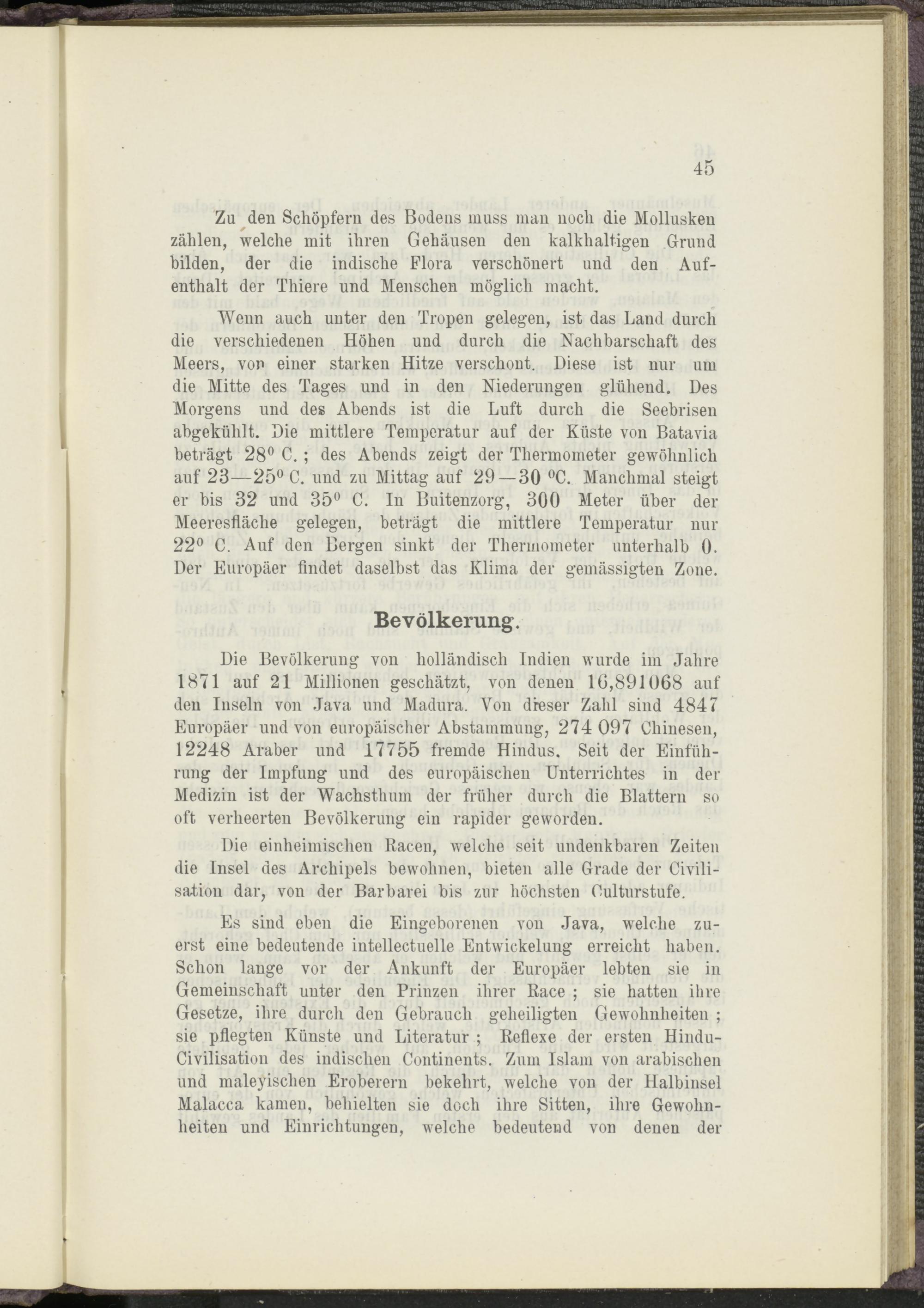 Die Bevölkerung von holländisch Indien wurde im Jahre 1871 auf 21 Millionen geschätzt, von denen 10,891068 auf den Inseln von Java und Madura. Von dieser Zahl sind 4847 Europäer und von europäischer Abstammung, 274 097 Chinesen, 12248 Araber und 17755 fremde Hindus. Seit der Einführung der Impfung und des europäischen Unterrichtes in der Medizin ist der Wachsthum der früher durch die Blattern so oft verheerten Bevölkerung ein rapider geworden.