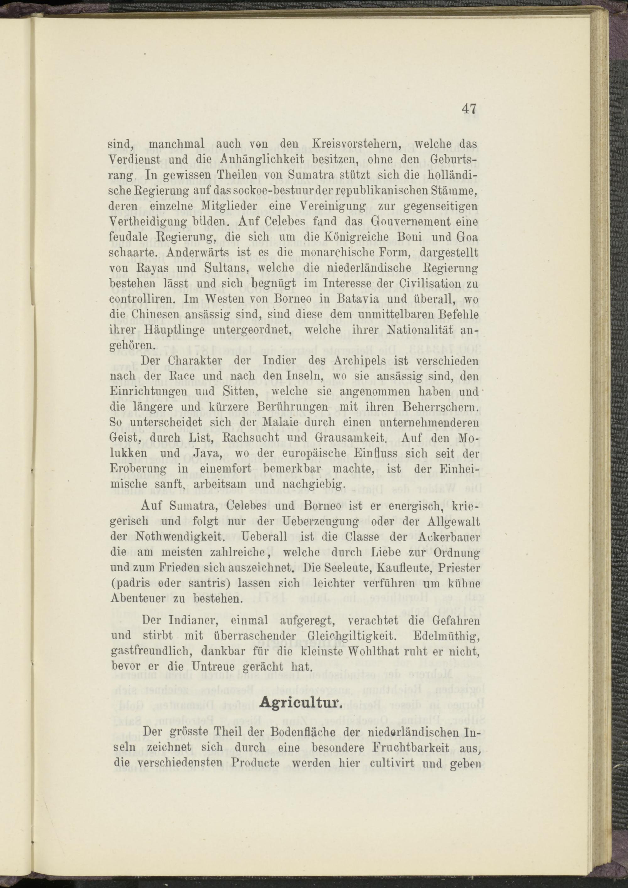 Auf Sumatra, Celebes und Borneo ist er energisch, kriegerisch und folgt nur der Ueberzeugung oder der Allgewalt der Notliwendigkeit. Ueberall ist die Classe der Ackerbauer die am meisten zahlreiche, welche durch Liebe zur Ordnung und zum Frieden sich auszeichnet. Die Seeleute, Kaufleute, Priester (padris oder santris) lassen sich leichter verführen um kühne Abenteuer zu bestehen.