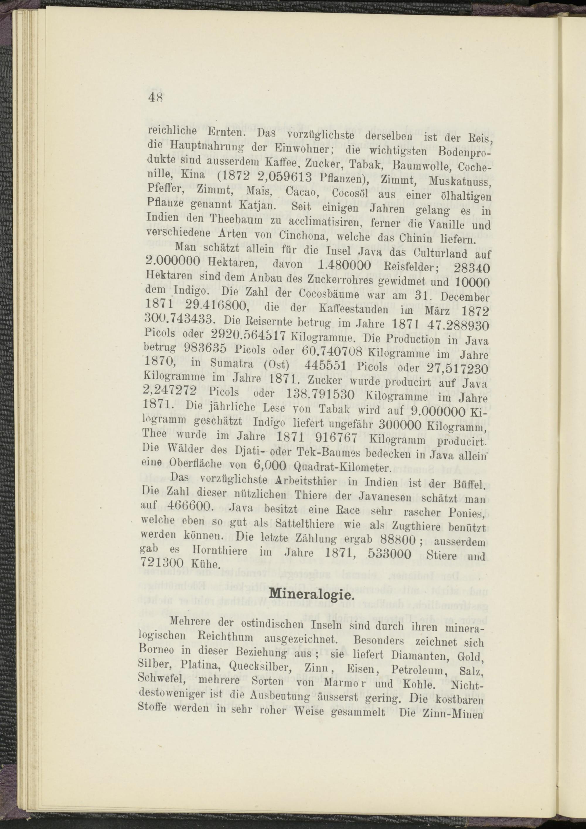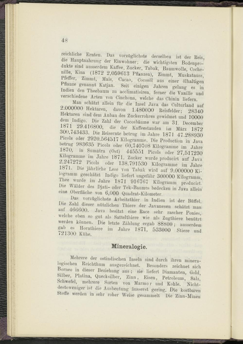 1871. Die jährliche Lese von Tabak wird auf 9.000000 Kilogramm geschätzt Indigo liefert ungefähr 300000 Kilogramm, Thee wurde im Jahre 1871 916767 Kilogramm producirt. Die Wälder des Djati- oder Tek-Baumes bedecken in Java allein eine Oberfläche von 6,000 Quadrat-Kilometer.