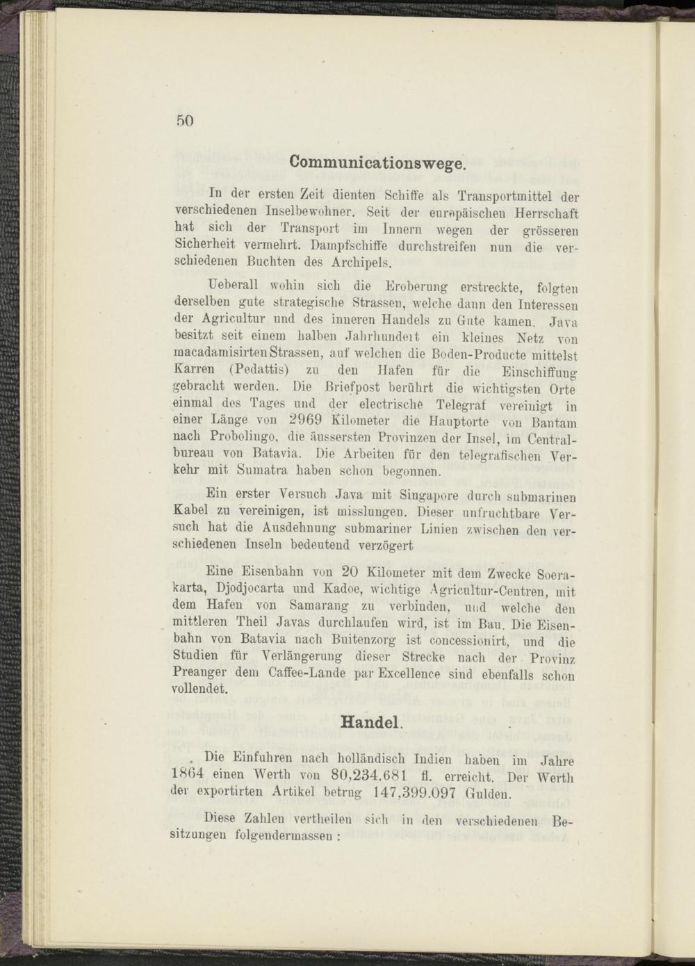 Eine Eisenbahn von 20 Kilometer mit dem Zwecke Soera- karta, Djodjocarta und Kadoe, wichtige Agricultur-Centren, mit dem Hafen von Samarang zu verbinden, und welche den mittleren Theil Javas durchlaufen wird, ist im Bau. Die Eisenbahn von Batavia nach Buitenzorg ist concessionirt, und die Studien für Verlängerung dieser Strecke nach der Provinz Preanger dem Caffee-Lande par Excellence sind ebenfalls schon vollendet.