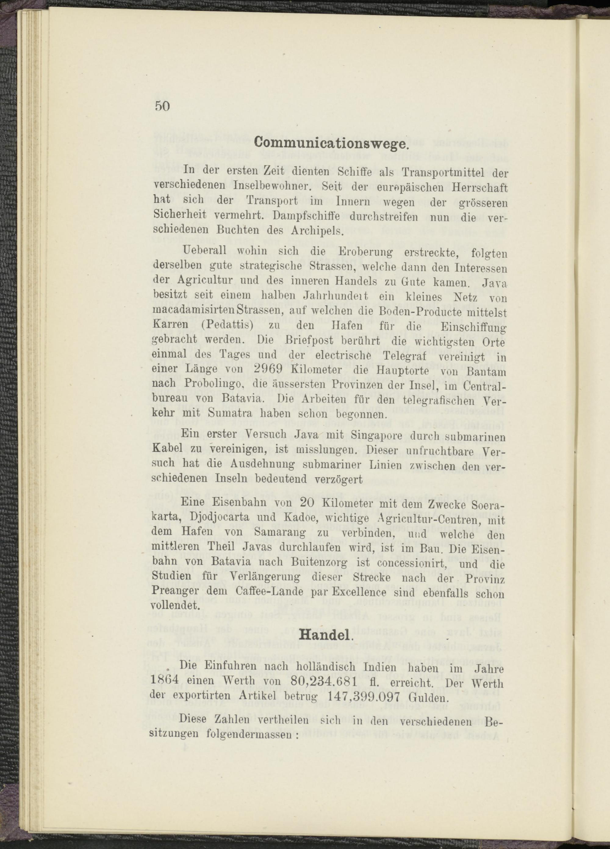Ueberall wohin sich die Eroberung erstreckte, folgten derselben gute strategische Strassen, welche dann den Interessen der Agricultur und des inneren Handels zu Gute kamen. Java besitzt seit einem halben Jahrhundeit ein kleines Netz von macadamisirten Strassen, auf welchen die Boden-Producte mittelst Karren (Pedattis) zu den Hafen für die Einschiffung gebracht werden. Die Briefpost berührt die wichtigsten Orte einmal des Tages und der electrische Telegraf vereinigt in einer Länge von 2969 Kilometer die Hauptorte von Bantam nach Probolingo, die äussersten Provinzen der Insel, im Centralbureau von Batavia. Die Arbeiten für den telegrafischen Verkehr mit Sumatra haben schon begonnen.