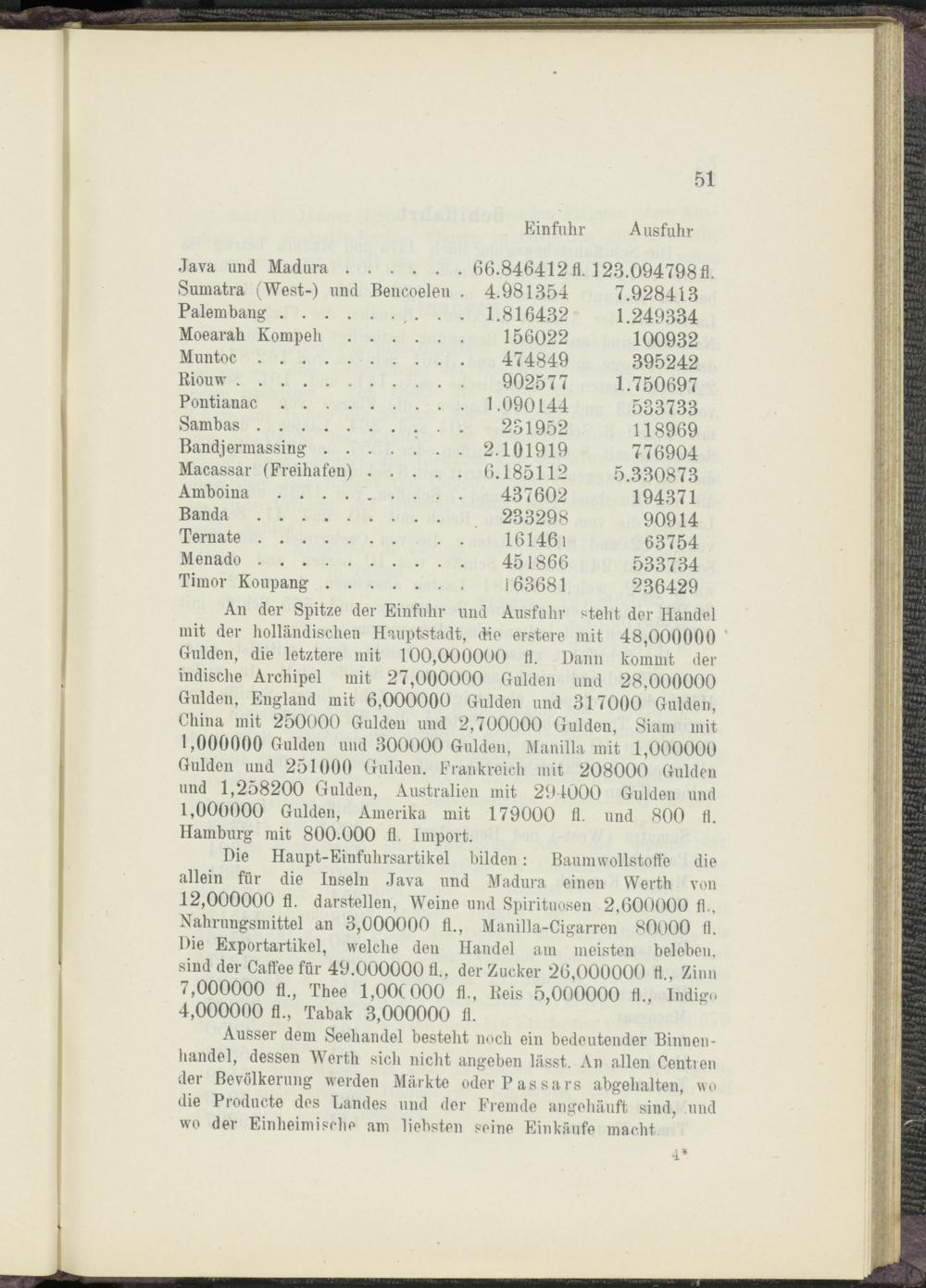 Die Haupt-Einfuhrsartikel bilden: Baumwollstoffe die allein für die Inseln Java und Madura einen Werth von 12,000000 fl. darstellen, Weine und Spirituosen 2,600000 fl.. Nahrungsmittel an 3,000000 fl., Manilla-Cigarren 80000 fl. Die Exportartikel, welche den Handel am meisten beleben, sind der Caffee für 49.000000 fl., der Zucker 26,000000 fl., Zinn 7,000000 fl., Thee 1,00(000 fl., Reis 5,000000 fl., Indigo 4,000000 fl., Tabak 3,000000 fl.