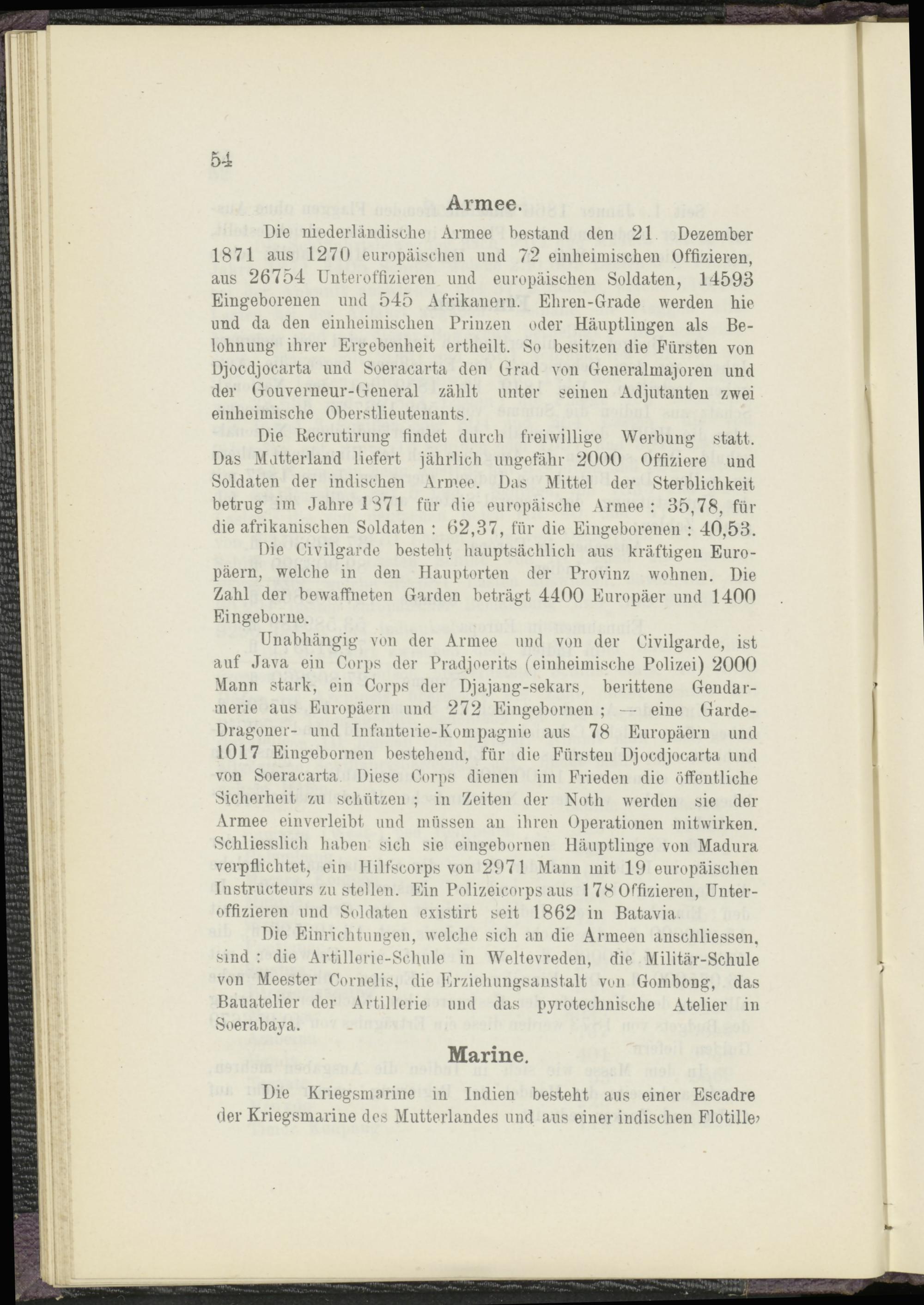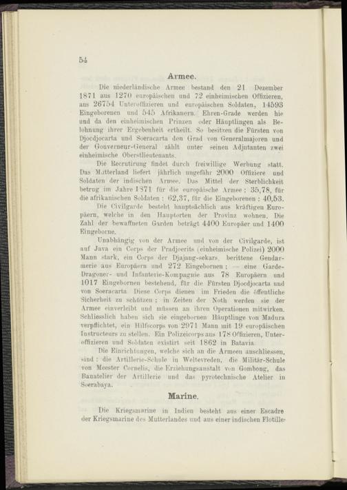 Die niederländische Armee bestand den 21 Dezember 1871 ans 1270 europäischen und 72 einheimischen Offizieren, aus 26754 Unteroffizieren und europäischen Soldaten, 14593 Eingeborenen und 545 Afrikanern. Ehren-Grade werden hie und da den einheimischen Prinzen oder Häuptlingen als Belohnung ihrer Ergebenheit ertheilt. So besitzen die Fürsten von Djocdjocarta und Soeracarta den Grad von Generalmajoren und der Gouverneur-General zählt unter seinen Adjutanten zwei einheimische Oberstlieuteuants.