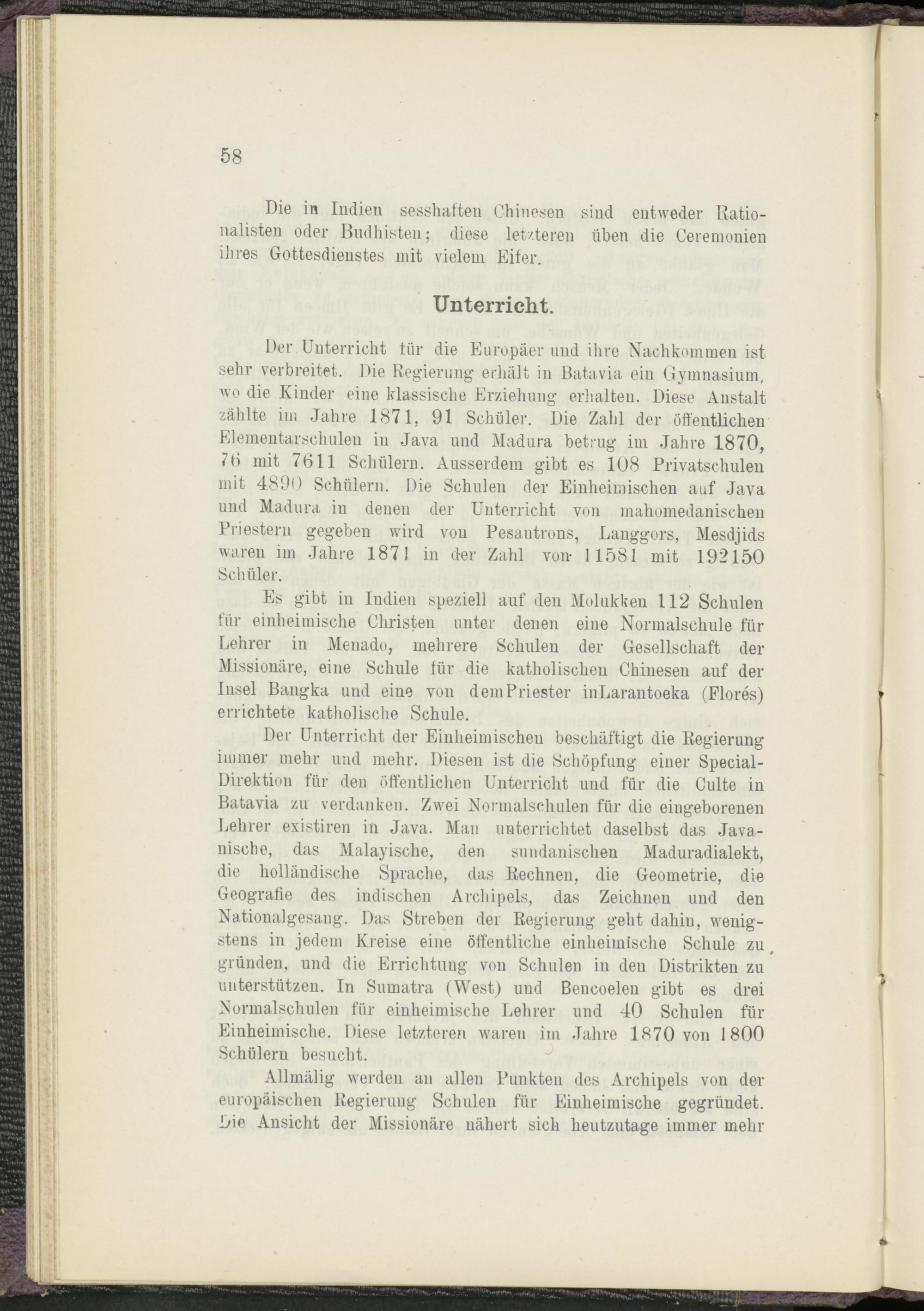 Der Unterricht für die Europäer und ihre Nachkommen ist sehr verbreitet. Die Regierung erhält in Batavia ein Gymnasium, wo die Kinder eine klassische Erziehung erhalten. Diese Anstalt zählte im Jahre 1871, 91 Schüler. Die Zahl der öffentlichen Elementarschulen in Java und Madura betrug im Jahre 1870, 7(1 mit 7611 Schülern. Ausserdem gibt es 108 Privatschulen mit 4890 Schülern. Die Schulen der Einheimischen auf Java und Madura in denen der Unterricht von mahomedanischen Priestern gegeben wird von Pesantrons, Langgors, Mesdjids waren im Jahre 1871 in der Zahl von- 11581 mit 192150 Schüler.