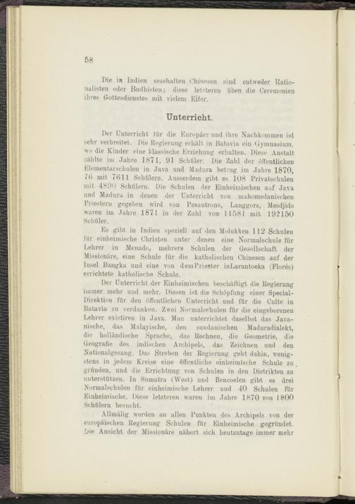 Der Unterricht der Einheimischen beschäftigt die Regierung immer mehr und mehr. Diesen ist die Schöpfung einer Special- Direktion für den öffentlichen Unterricht und für die Gülte in Batavia zu verdanken. Zwei Normalschulen für die eingeborenen Lehrer existiren in Java. Man unterrichtet daselbst das Javanische, das Malayische, den sundanischen Maduradialekt, die holländische Sprache, das Rechnen, die Geometrie, die Geografie des indischen Archipels, das Zeichnen und den Nationalgesang. Das Streben der Regierung geht dahin, wenigstens in jedem Kreise eine öffentliche einheimische Schule zu gründen, und die Errichtung von Schulen in den Distrikten zu unterstützen. In Sumatra (West) und Bencoelen gibt es drei Normalschulen für einheimische Lehrer und 40 Schulen für Einheimische. Diese letzteren waren im Jahre 1870 von 1800 Schülern besucht.