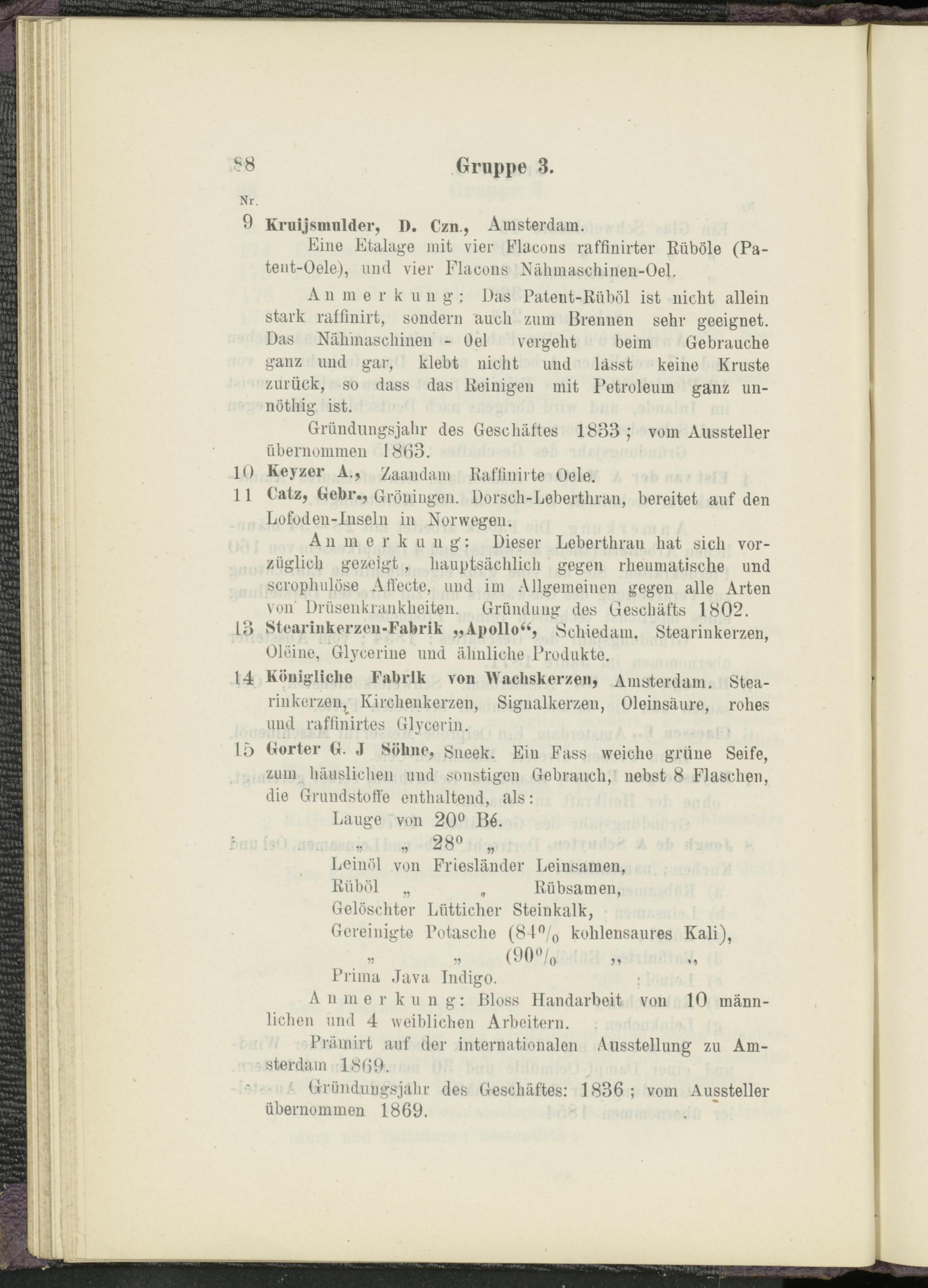 14 Königliche Fabrik von Wachskerzen, Amsterdam. Stearinkerzen, Kirchenkerzen, Signalkerzen, Oleinsäure, rohes und raflinirtes Glycerin.