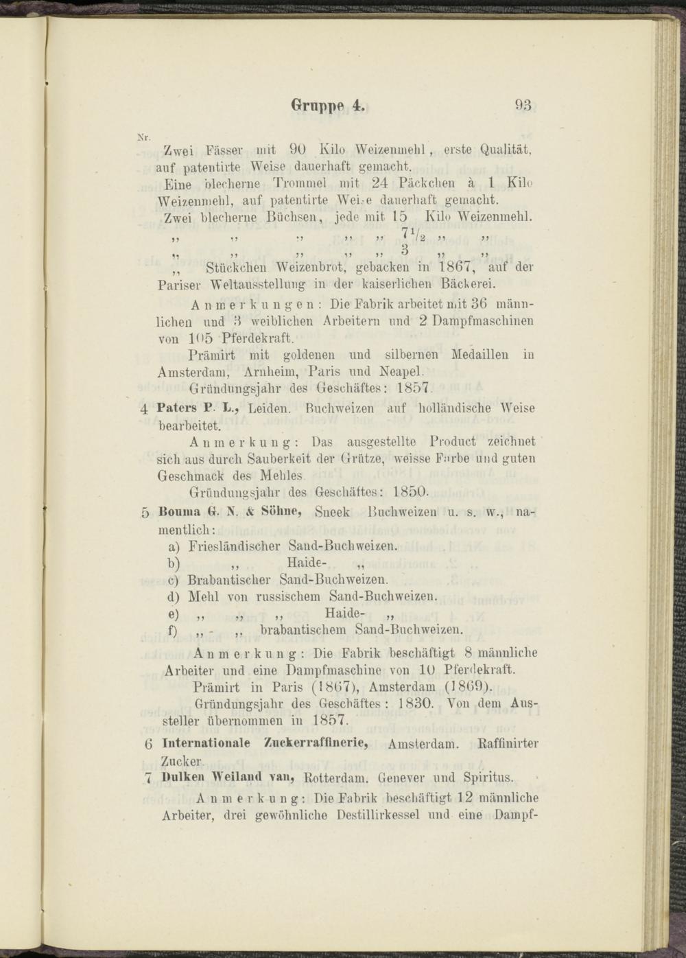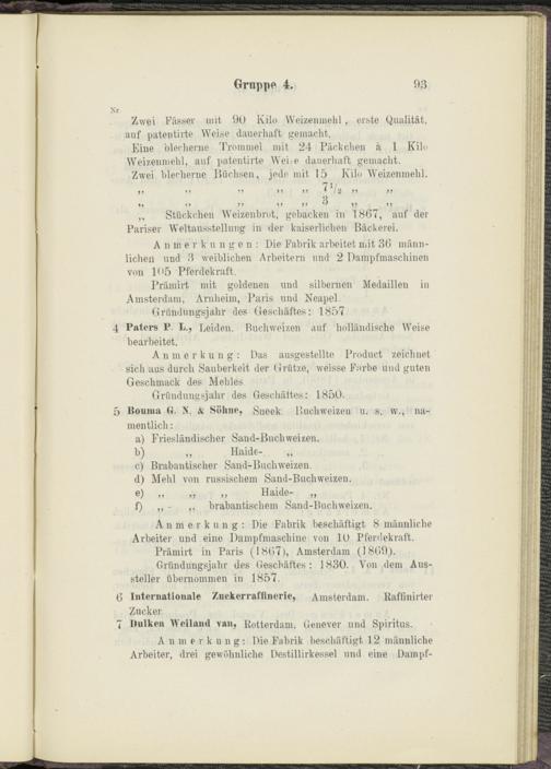 Anmerkung: Die Fabrik beschäftigt 8 männliche Arbeiter und eine Dampfmaschine von 10 Pferdekraft. Prämirt in Paris (1867), Amsterdam (1869). Gründungsjahr des Geschäftes: 1830. Von dem Aussteller übernommen in 1857.