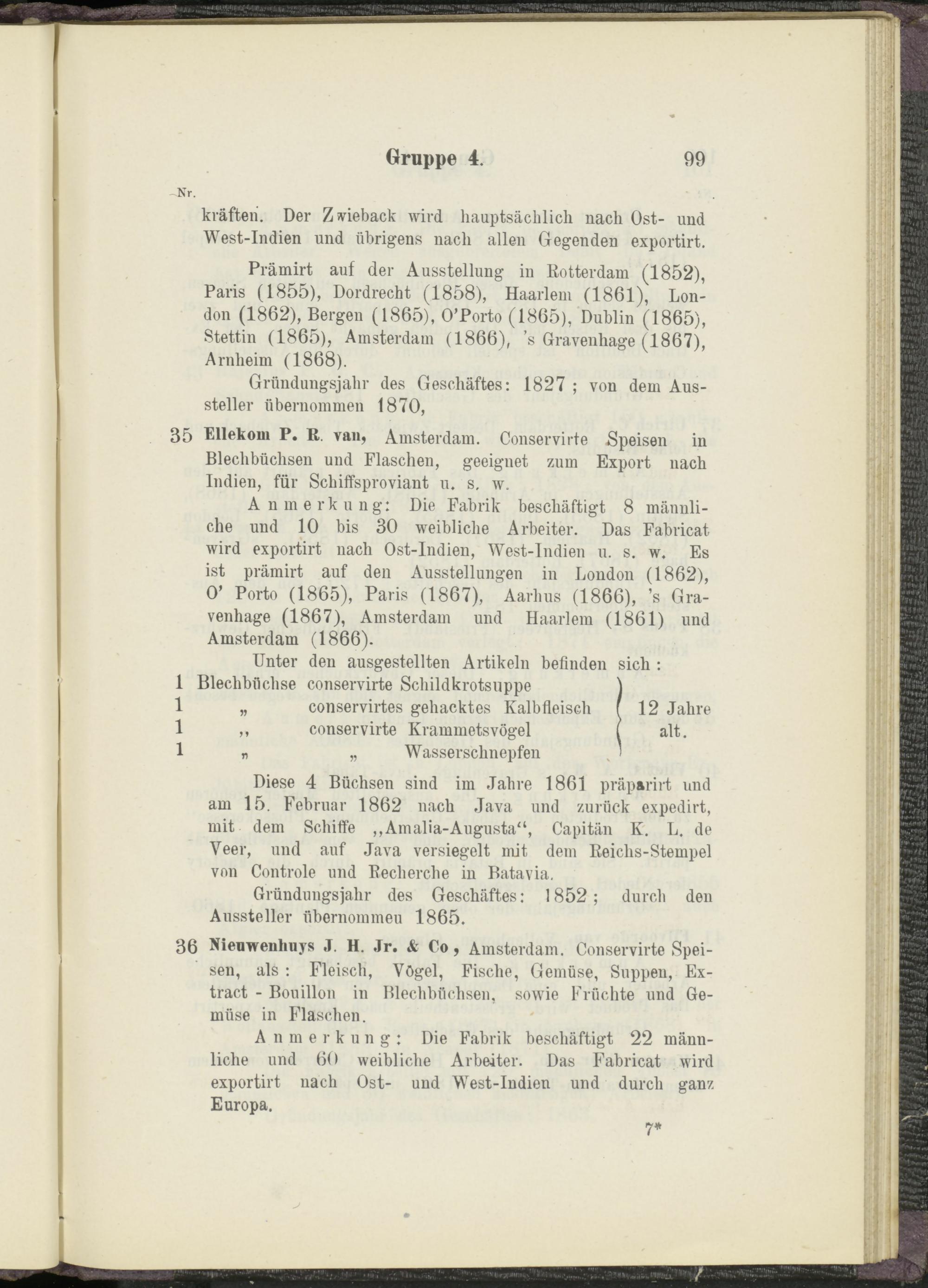36 Nienwenhuys J. H. Jr. & Co, Amsterdam. Conservirte Speisen, als : Fleisch, Vögel, Fische, Gemüse, Suppen, Ex- tract - Bouillon in Blechbüchsen, sowie Früchte und Gemüse in Flaschen.