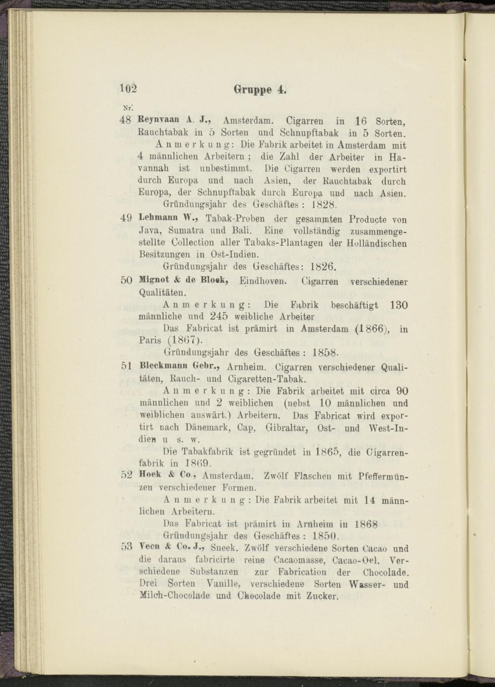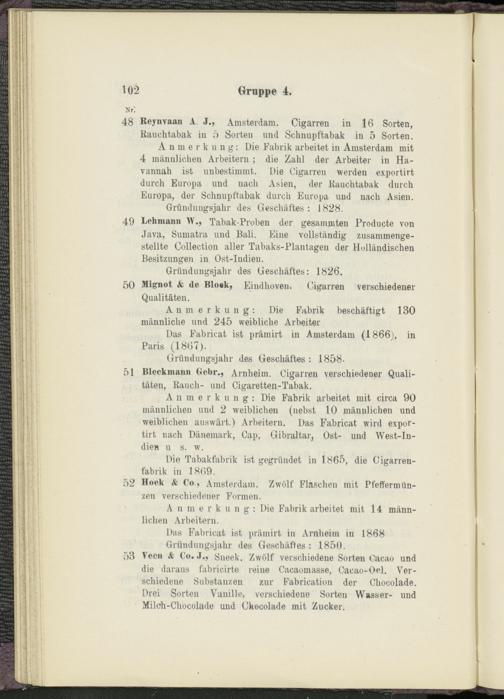 Anmerkung: Die Fabrik arbeitet in Amsterdam mit 4 männlichen Arbeitern ; die Zahl der Arbeiter in Ha- vannah ist unbestimmt. Die Cigarren werden exportirt durch Europa und nach Asien, der Rauchtabak durch Europa, der Schnupftabak durch Europa und nach Asien.