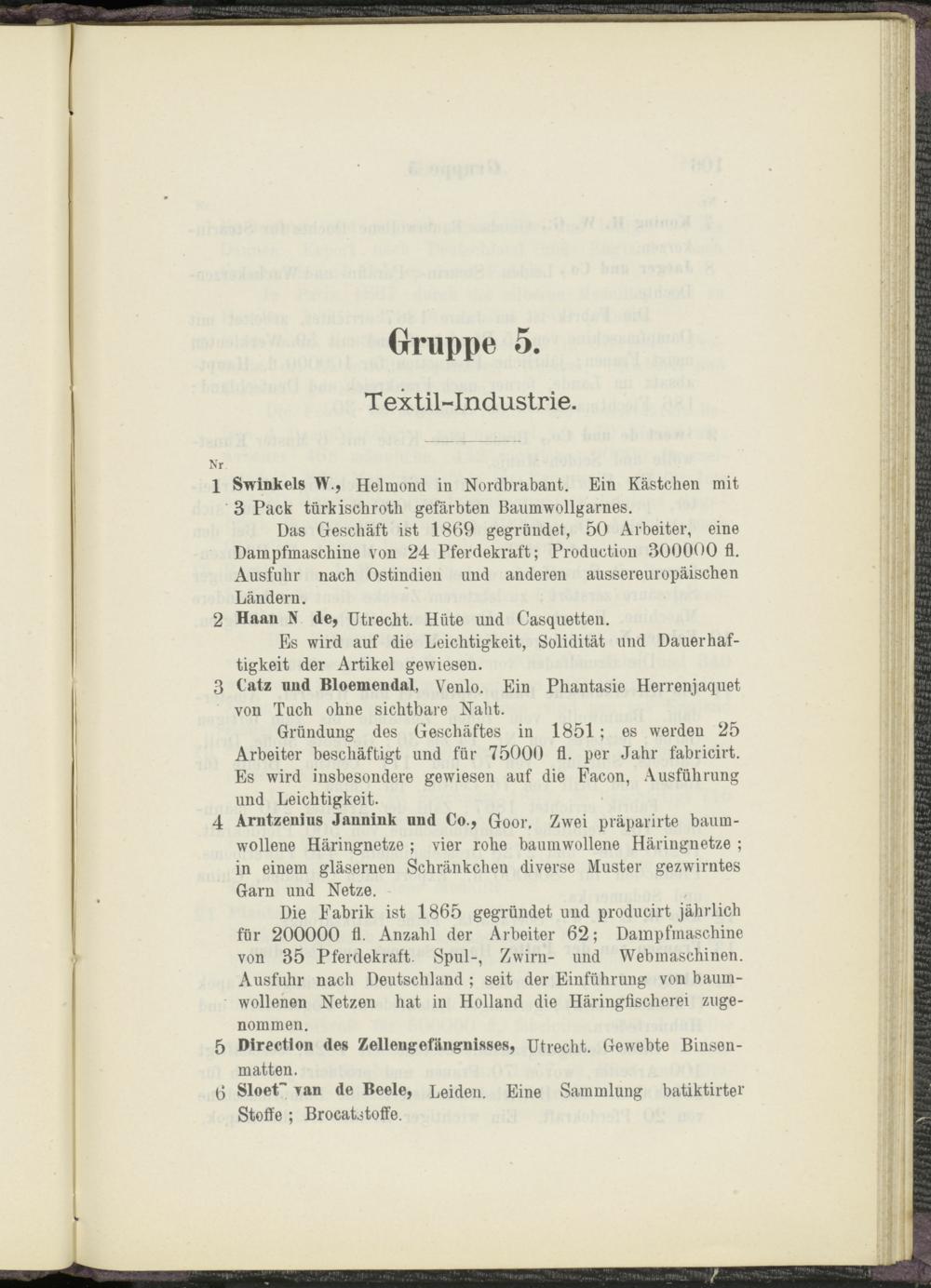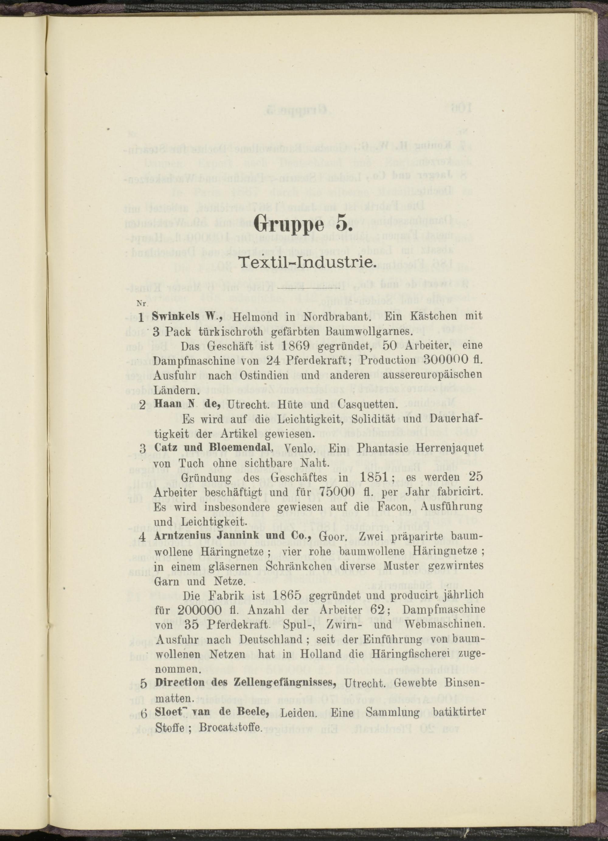 Die Fabrik ist 1865 gegründet und producirt jährlich für 200000 fl. Anzahl der Arbeiter 62; Dampfmaschine von 35 Pferdekraft. Spul-, Zwirn- und Webmaschinen. Ausfuhr nach Deutschland ; seit der Einführung von baumwollenen Netzen hat in Holland die Häringfischerei zugenommen.