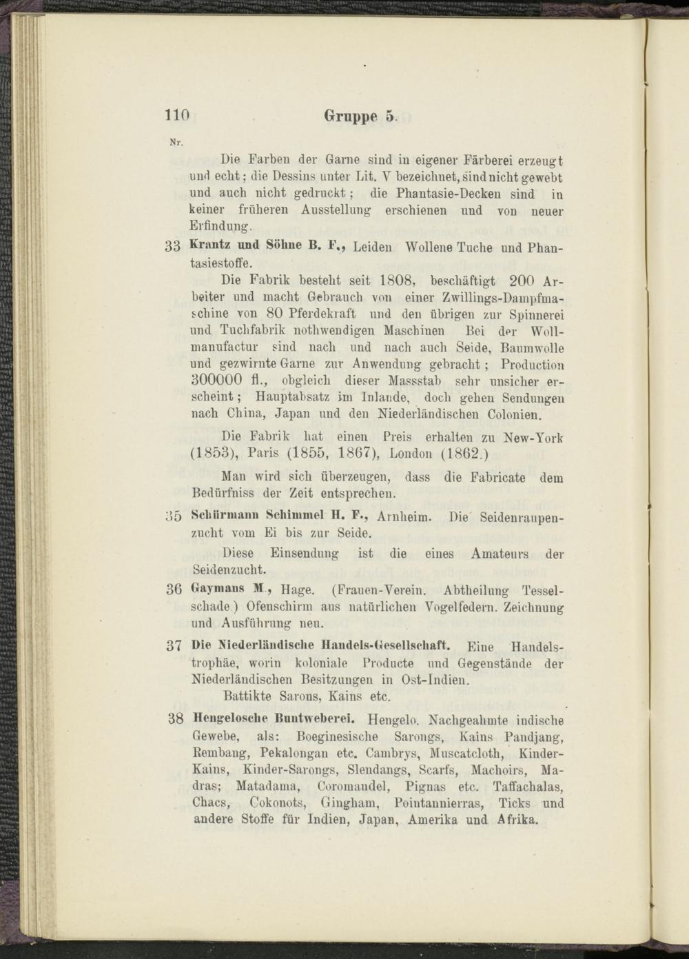 Die Fabrik besteht seit 1808, beschäftigt 200 Arbeiter und macht Gebrauch von einer Zwillings-Dampfmaschine von 80 Pferdekraft und den übrigen zur Spinnerei und Tuchfabrik nothwendigen Maschinen Bei der Woll- manufactur sind nach und nach auch Seide, Baumwolle und gezwirnte Garne zur Anwendung gebracht; Production 300000 fl., obgleich dieser Massstab sehr unsicher erscheint ; Hauptabsatz im Inlaude, doch gehen Sendungen nach China, Japan und den Niederländischen Colonien.
