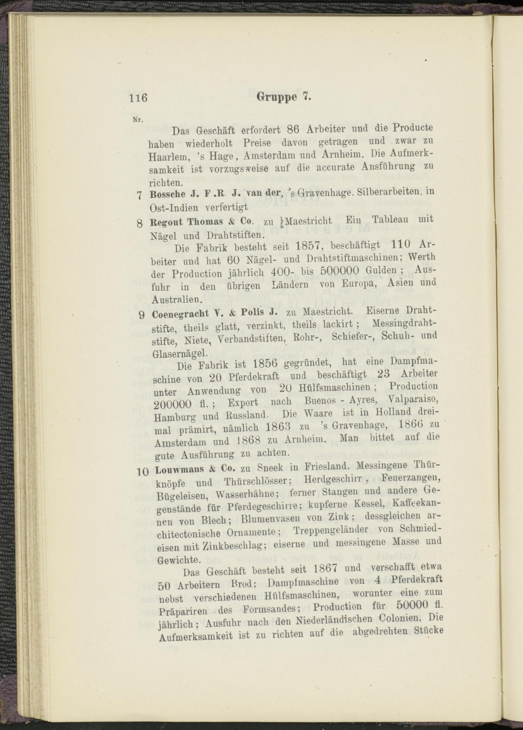 Die Fabrik ist 1856 gegründet, hat eine Dampfmaschine von 20 Pferdekraft und beschäftigt 23 Arbeiter unter Anwendung von 20 Hülfsmaschinen; Production 200000 fl. ; Export nach Buenos - Ayres, Valparaiso, Hamburg und Russland. Die Waare ist in Holland dreimal prämirt, nämlich 1863 zu ’s Gravenhage, 1866 zu Amsterdam und 1868 zu Arnheim. Man bittet auf die gute Ausführung zu achten.