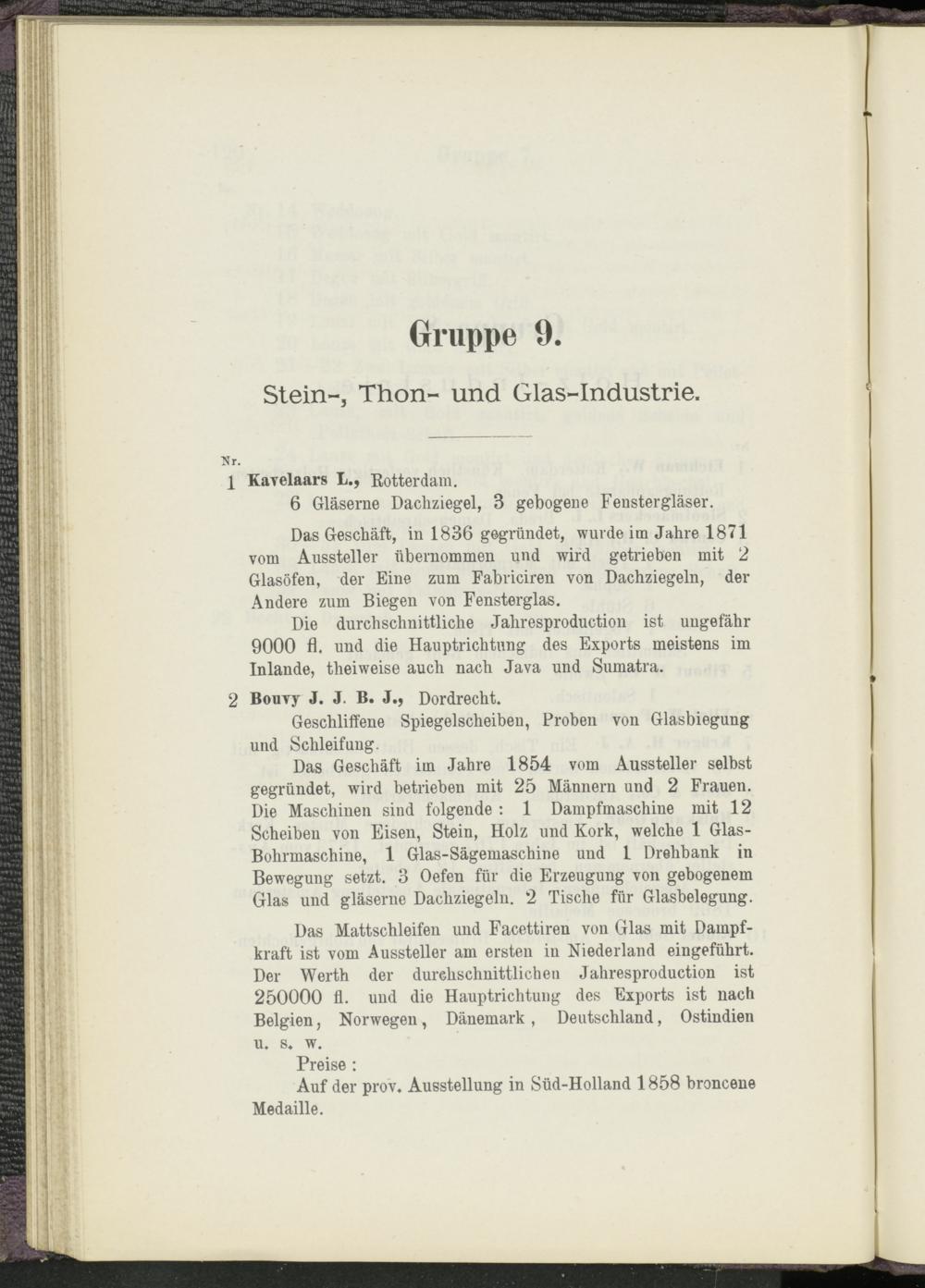 Das Mattschleifen und Facettiren von Glas mit Dampfkraft ist vom Aussteller am ersten in Niederland eingeführt. Der Werth der durchschnittlichen Jahresproduction ist 250000 fl. und die Hauptrichtung des Exports ist nach Belgien, Norwegen, Dänemark , Deutschland, Ostindien u, s« w.