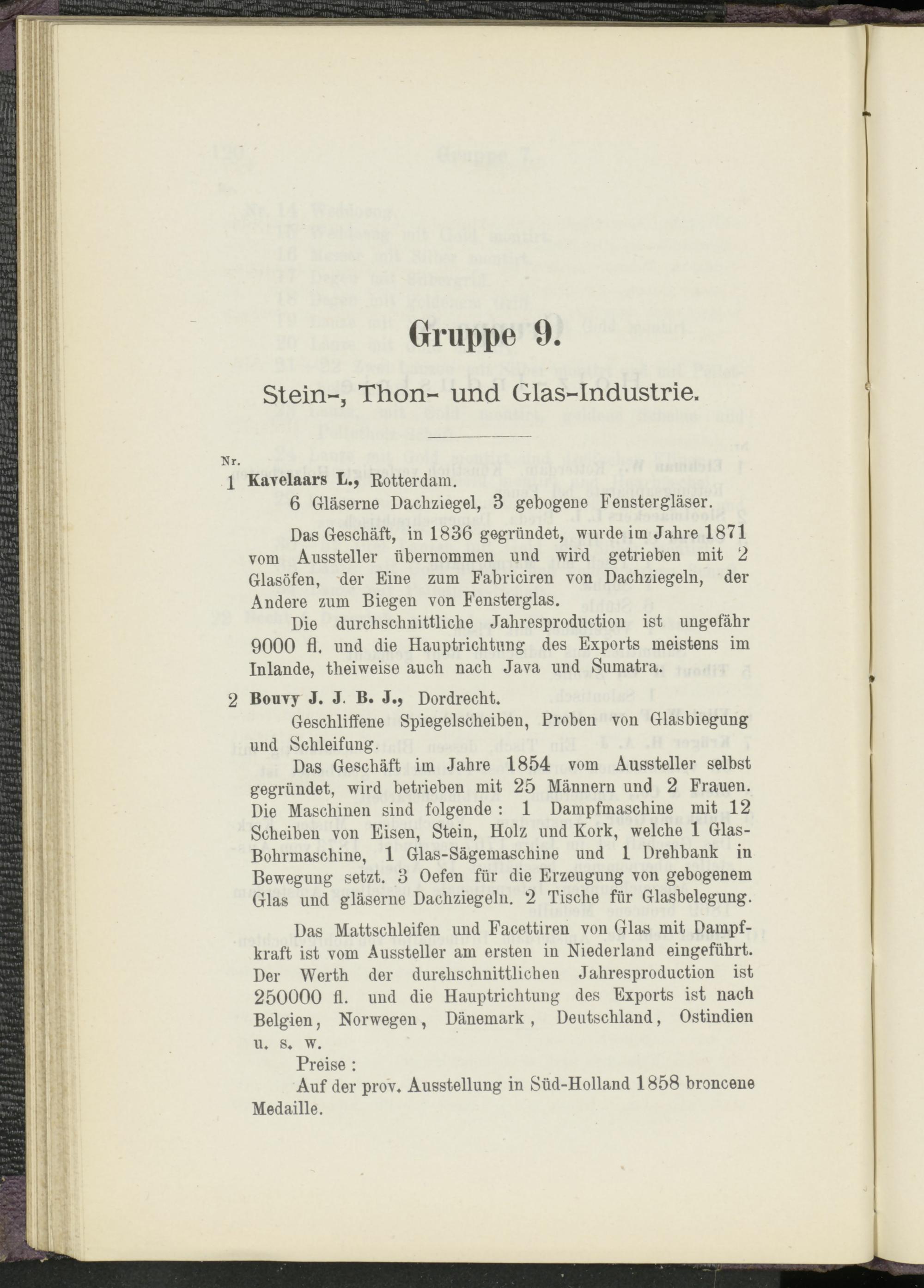 Das Geschäft, in 1836 gegründet, wurde im Jahre 1871 vom Aussteller übernommen und wird getrieben mit 2 Glasöfen, der Eine zum Fabriciren von Dachziegeln, der Andere zum Biegen von Fensterglas.