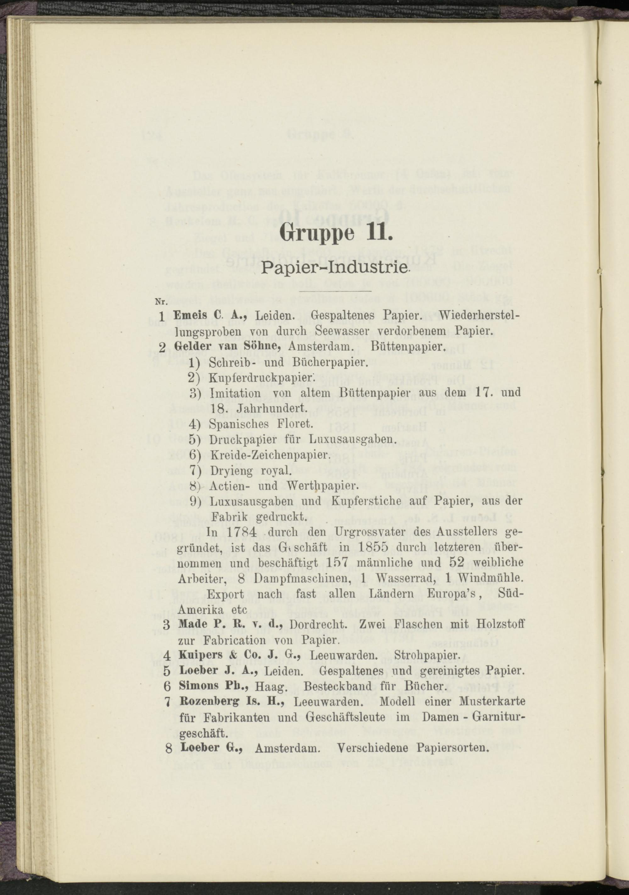 In 1784 durch den Urgrossvater des Ausstellers gegründet, ist das G* schüft in 1855 durch letzteren übernommen und beschäftigt 157 männliche und 52 weibliche Arbeiter, 8 Dampfmaschinen, 1 Wasserrad, 1 Windmühle.