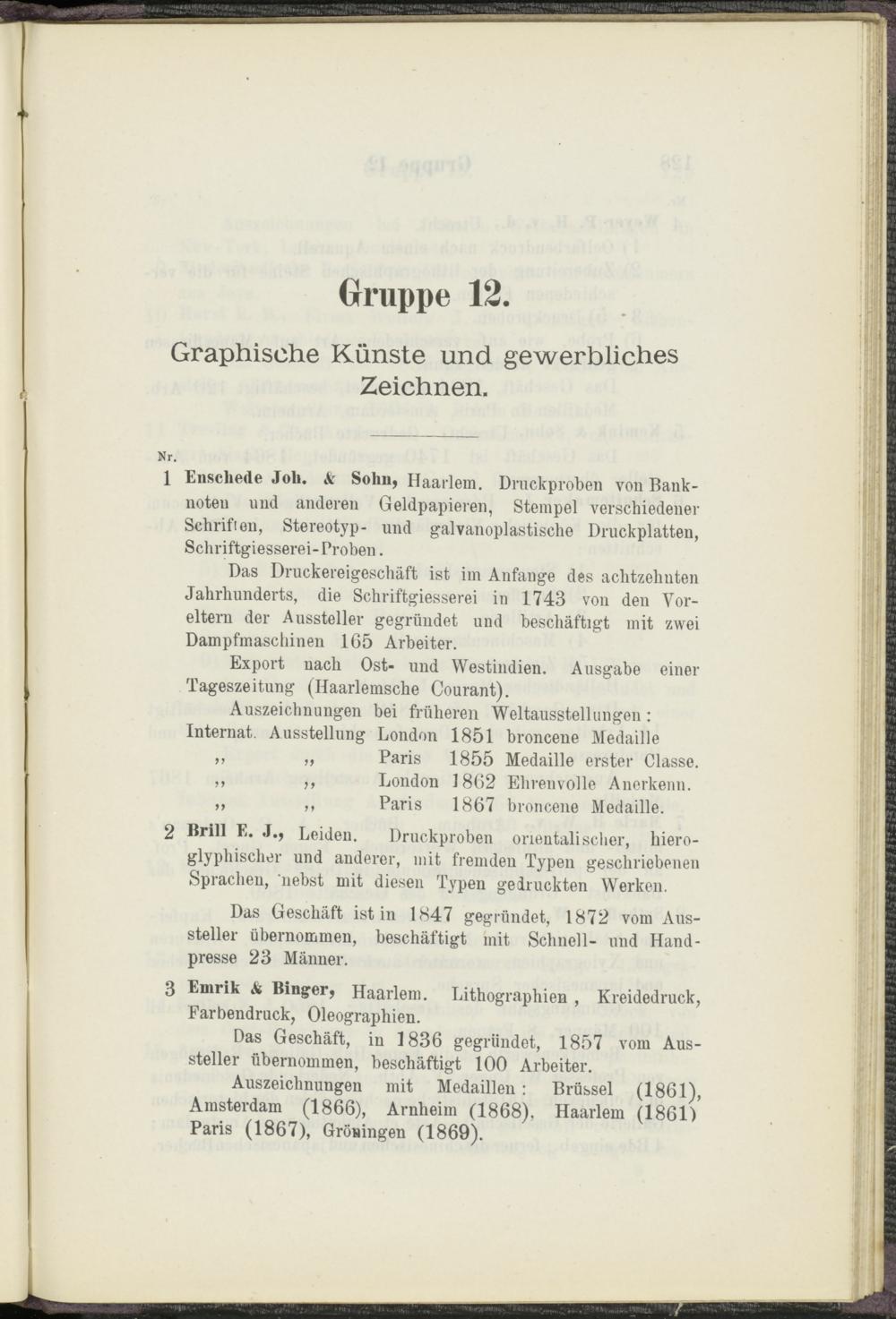 Das Druckereigeschäft ist im Anfänge des achtzehnten Jahrhunderts, die Sclrriftgiesserei in 1743 von den Voreltern der Aussteller gegründet und beschäftigt mit zwei Dampfmaschinen 1G5 Arbeiter.