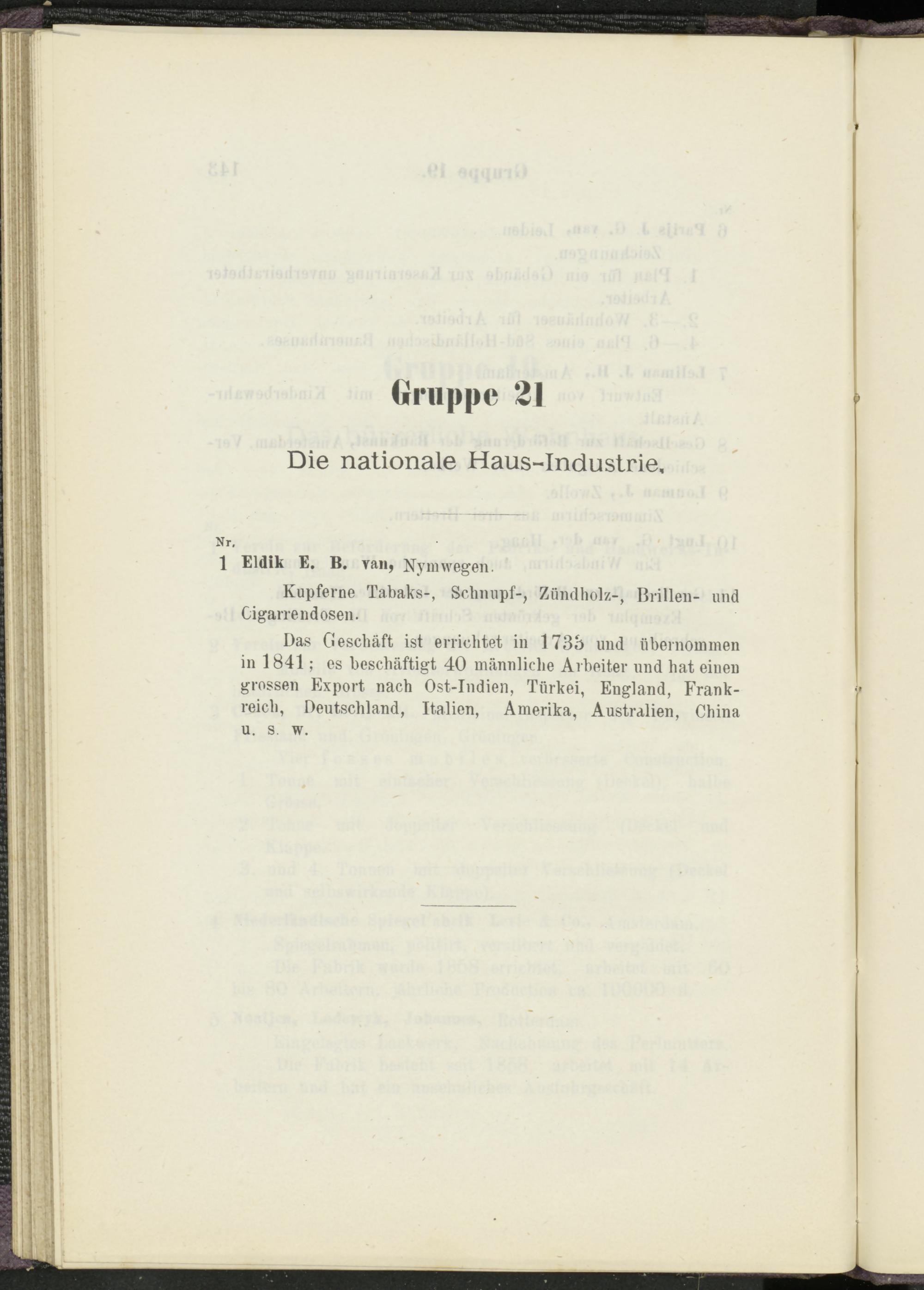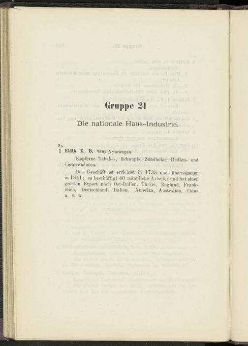 Das Geschäft ist errichtet in 173b und übernommen in 1841; es beschäftigt 40 männliche Arbeiter und hat einen grossen Export nach Ost-Indien, Türkei, England, Frankreich, Deutschland, Italien, Amerika, Australien, China
