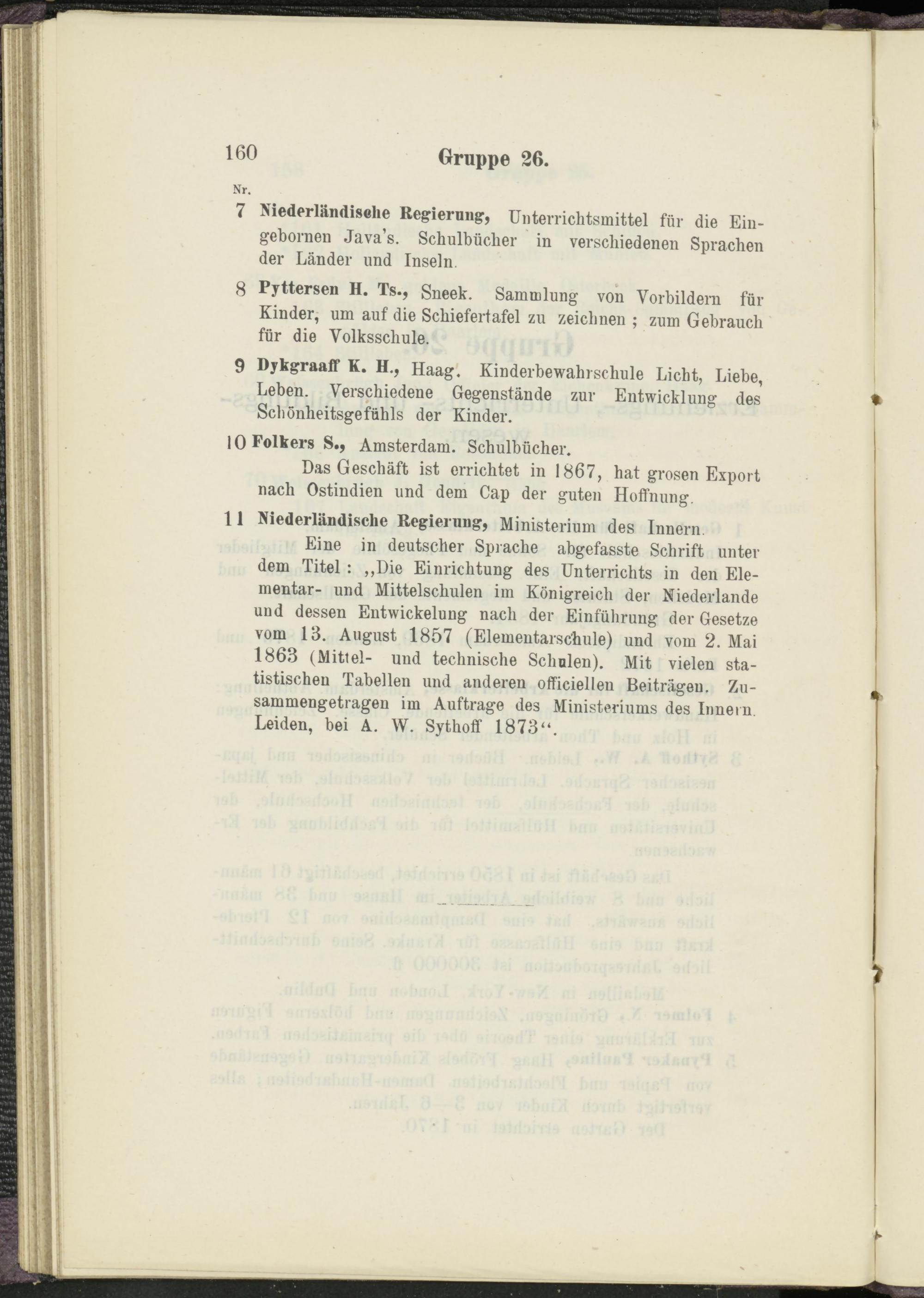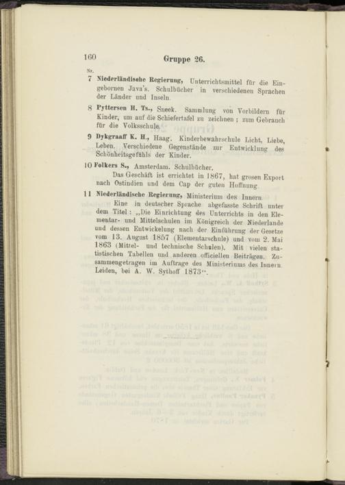 Eine in deutscher Sprache abgefasste Schrift unter dem Titel : ,,Die Einrichtung des Unterrichts in den Elementar- und Mittelschulen im Königreich der Niederlande und dessen Entwickelung nach der Einführung der Gesetze vom 13. August 1857 (Elementarschule) und vom 2. Mai 1863 (Mittel- und technische Schulen). Mit vielen statistischen Tabellen und anderen officiellen Beiträgen. Zusammengetragen im Aufträge des Ministeriums des Innern. Leiden, bei A. W. Sythoff 1873“.
