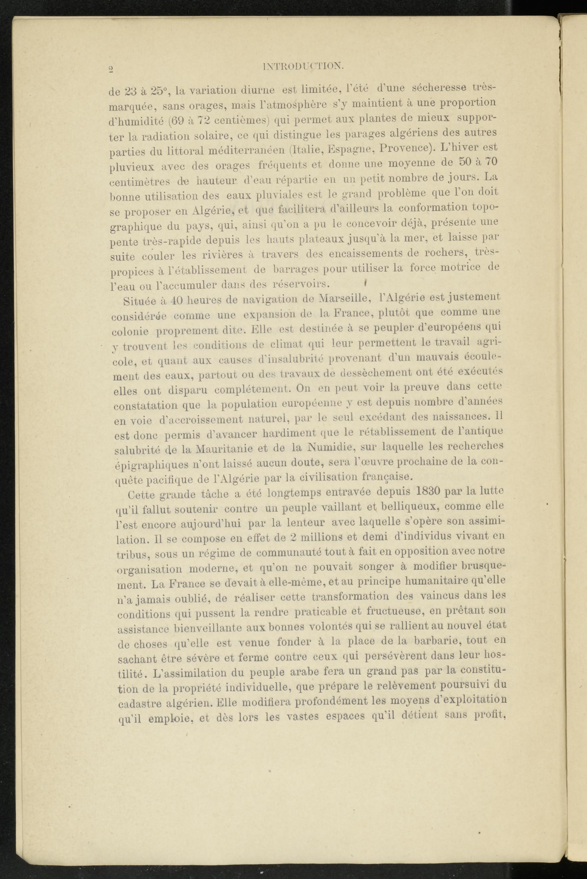 Située à 40 heures de navigation de Marseille, l’Algérie est justement considérée comme une expansion de la France, plutôt que comme une colonie proprement dite. Elle est destinée à se peupler d’européens qui y trouvent les conditions de climat qui leur permettent le travail agricole, et quant aux causes d’insalubrité provenant d’un mauvais écoulement des eaux, partout ou des travaux de dessèchement ont été exécutés elles ont disparu complètement. On en peut voir la preuve dans cette constatation que la population européenne y est depuis nombre d’années en voie d’accroissement naturel, par le seul excédant des naissances. 11 est donc permis d’avancer hardiment que le rétablissement de l’antique salubrité de la Mauritanie et de la Psumidie, sur laquelle les recherches épigraphiques n’ont laissé aucun doute, sera l’œuvre prochaine de la conquête pacifique de l’Algérie par la civilisation française.